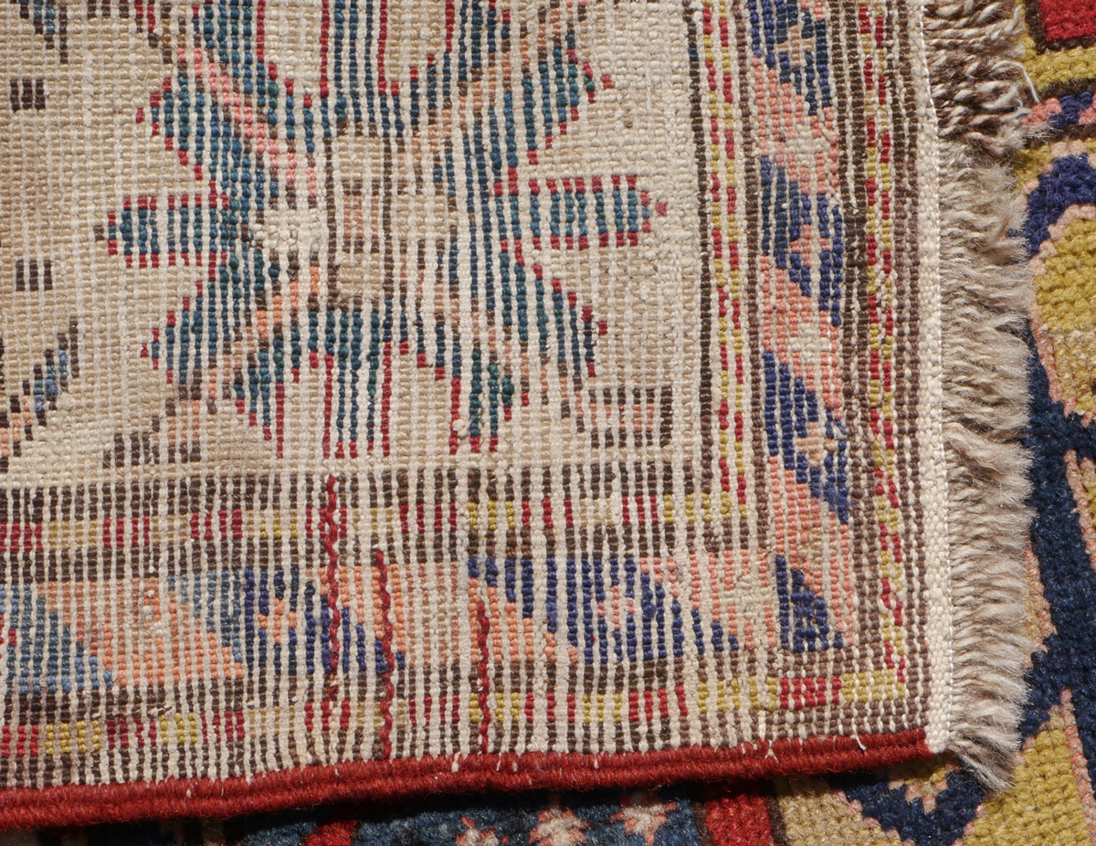 ANTIQUE CAUCASIAN KAZAK HAND KNOTTED WOOL RUG, 3'4'' x 9': This classic Kazak has a striking pattern of shield like medallions with latch hooked edges in colors of red, yellow and pale yellow on a medium blue field. The ivory ground main border has a repeating design of crab-like flowers in the same colors used in the field.