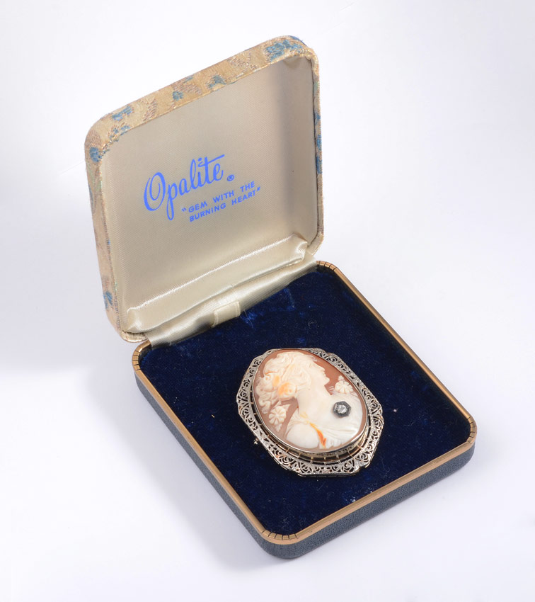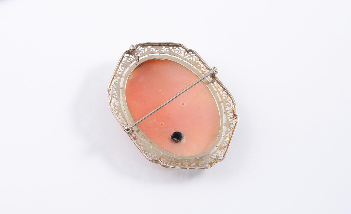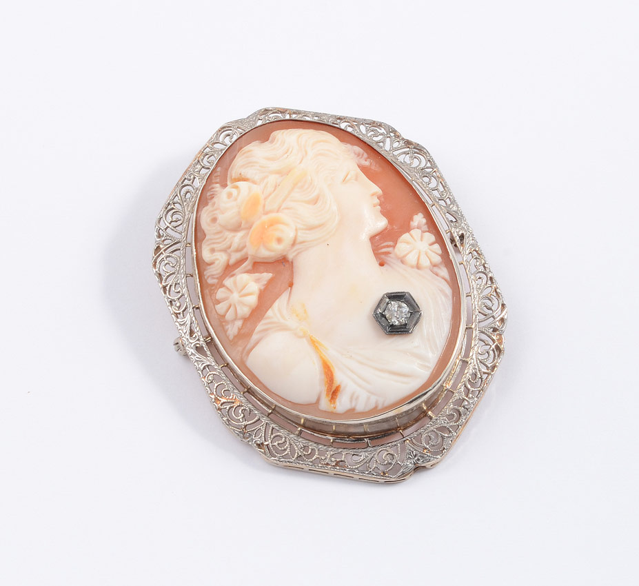 LARGE 14k CAMEO HABILLE PENDANT BROOCH: Filigree 14K framed carved shell portrait cameo. She has a diamond on her chest (no chain). Measures 2 1/4'' x 1 1/2''.