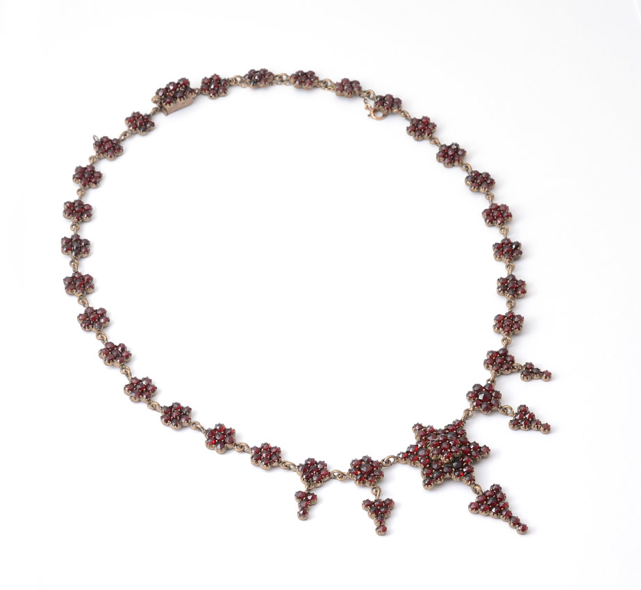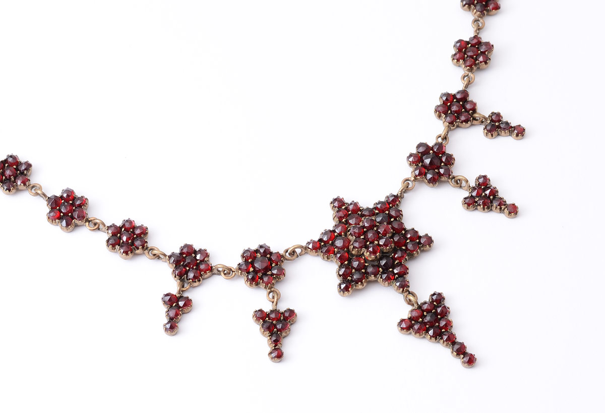 VICTORIAN ERA GARNET NECKLACE: Garnet covered star center with drop, suspended from a chain of garnet daisies. Approx. 17 1/2''.