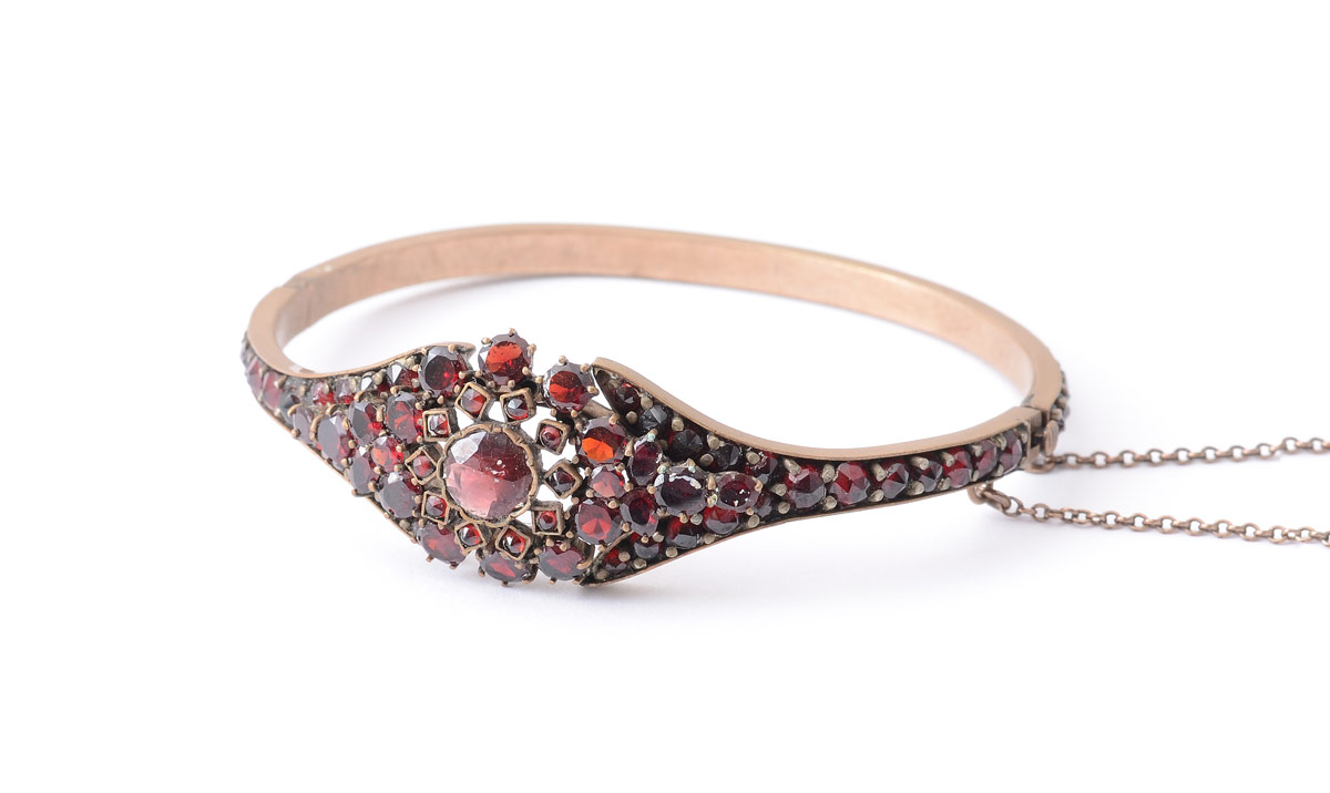 VICTORIAN ERA GARNET BANGLE BRACELET: Hinged bracelet covered in faceted garnets. Clasp and safety chain closure.