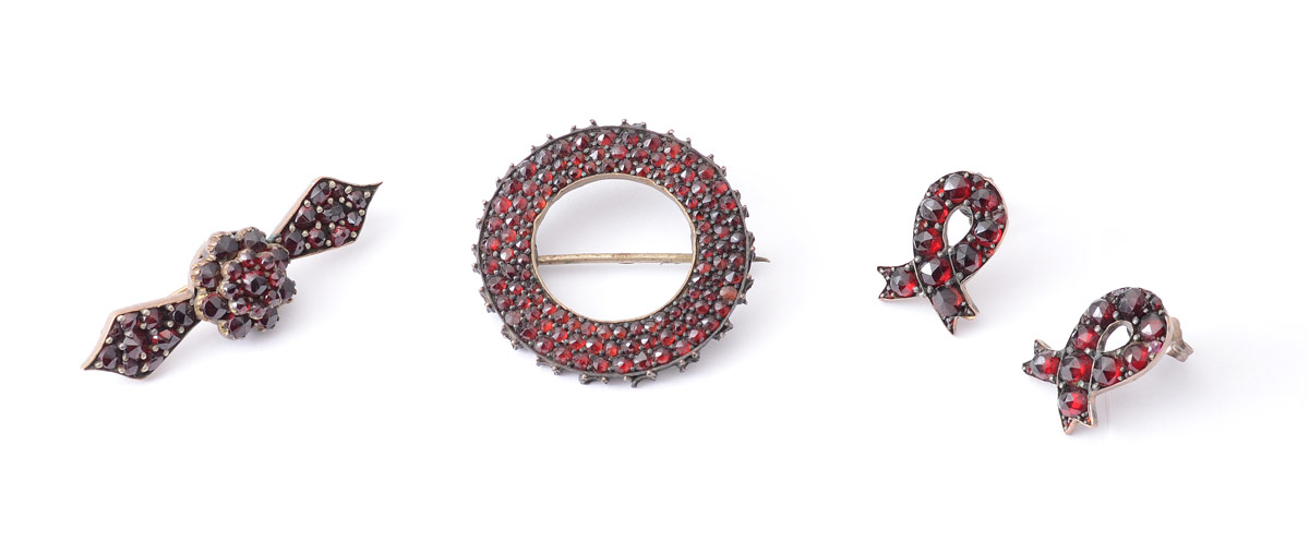 3 PIECE VICTORIAN GARNET PINS & EARRINGS: 1) Watch pin, 1 1/2''l. 2) Circle pin, 1 1/4'' dia. 3) Pair ribbon form earrings, converted to posts.