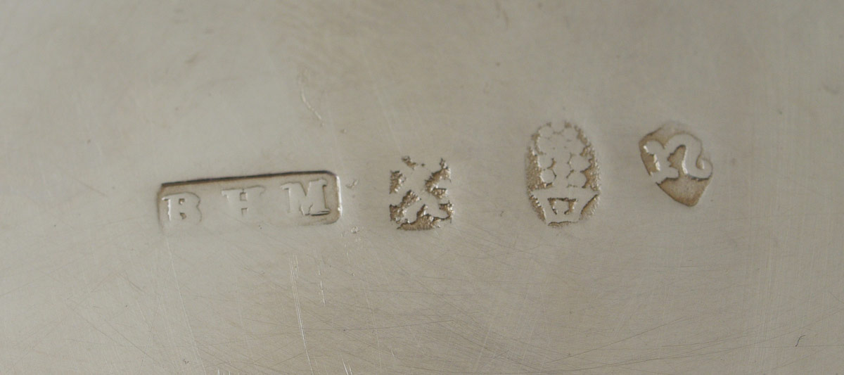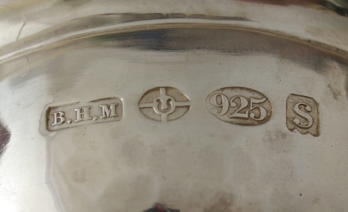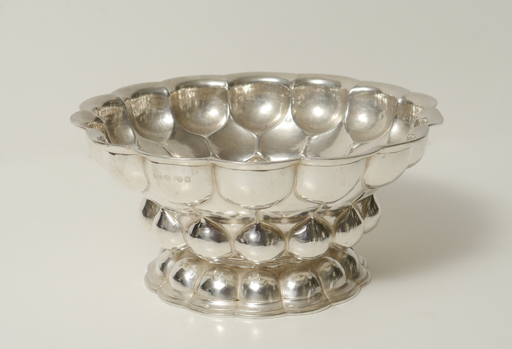 NERESHEIMER HANAU STERLING SILVER CENTERPIECE: Silver centerpiece by B. Nersheimer & Son, marked with N in shield, flowerpot, lion, B. H. M.. Also marked with Berthold Hermann Muller, London import marks for 1913. 3 7/8'' h. x 8 1/2''. Approx. 17.4 troy oz.