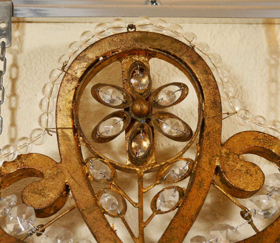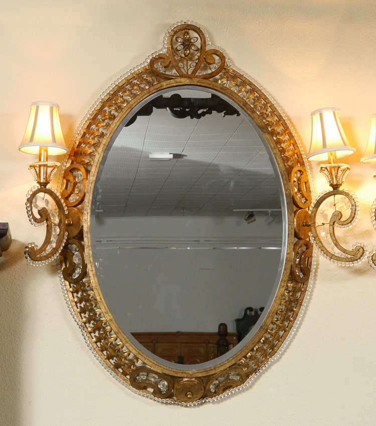 QUOIZEL GILT MIRROR WITH SIDE LIGHTS: Pierced gilt metal frame with crystal prism accents and crystal bead border. Beveled glass mirror. Light at either side. Marked Quoizel. Overall 45 1/2'' h. x 40'' x 7''. Please see matching mirror next lot 279.
