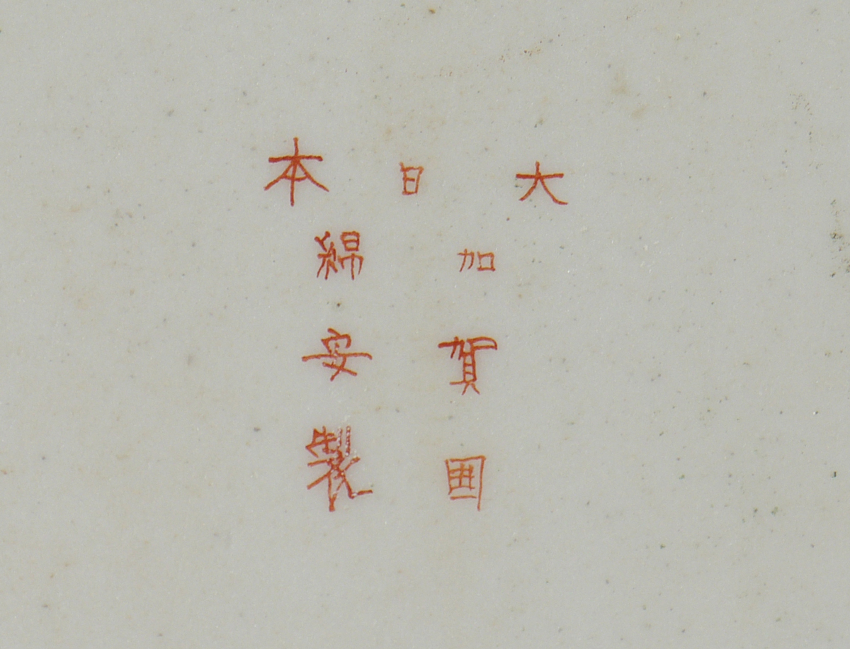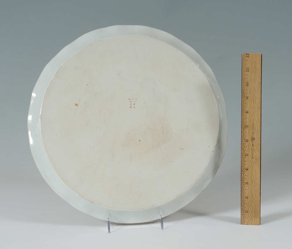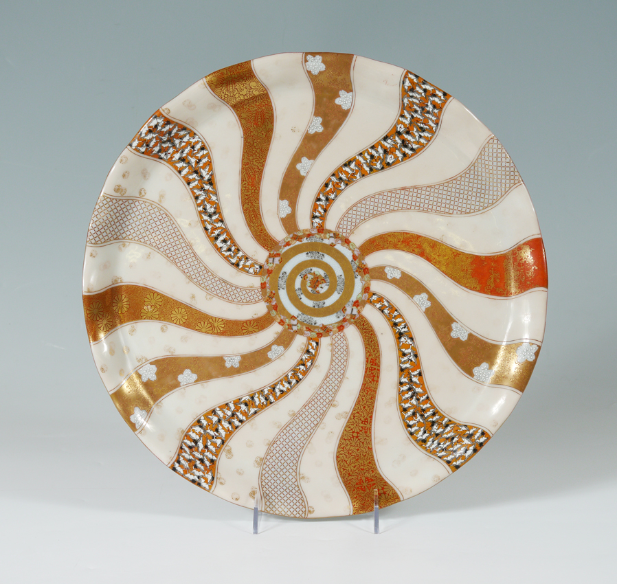 SATSUMA PINWHEEL CHARGER: Unique pinwheel motif with bands of flying cranes, geometric, and floral motifs. Signed on base. 14 3/4'' dia.