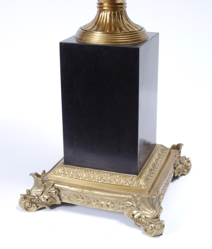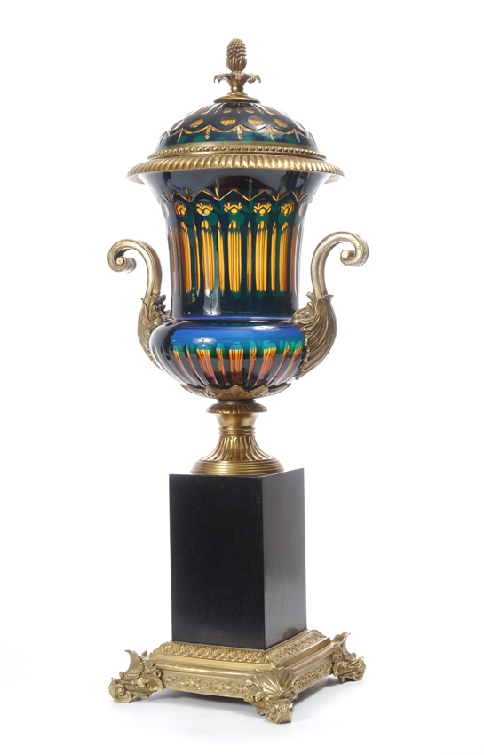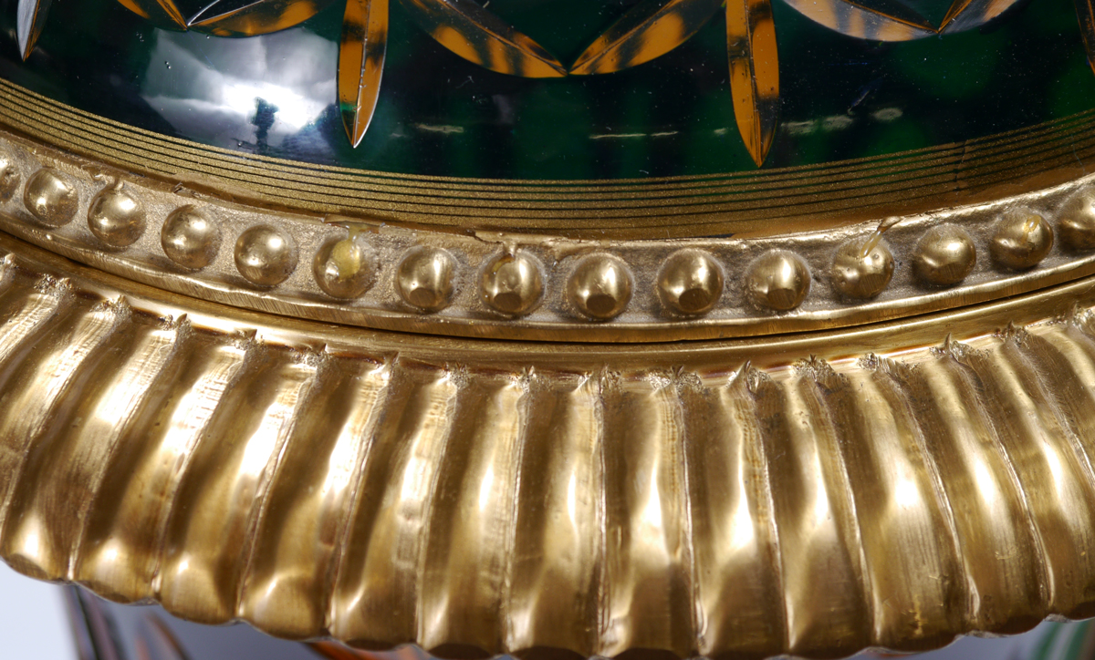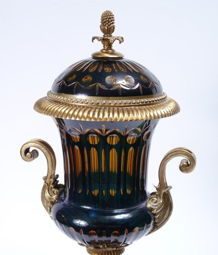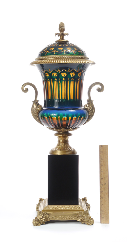 LARGE BOHEMIAN BLUE CRYSTAL COVERED URN: Late 20th century, blue cut to amber color urn with gilt metal mounts. On black stone plinth, case gilt metal base. Overall 31 1/2'' h. x 13 1/2''.