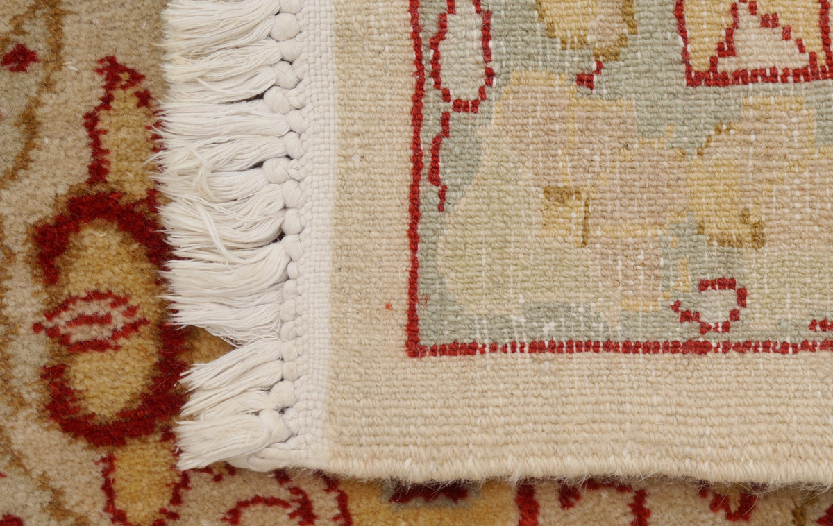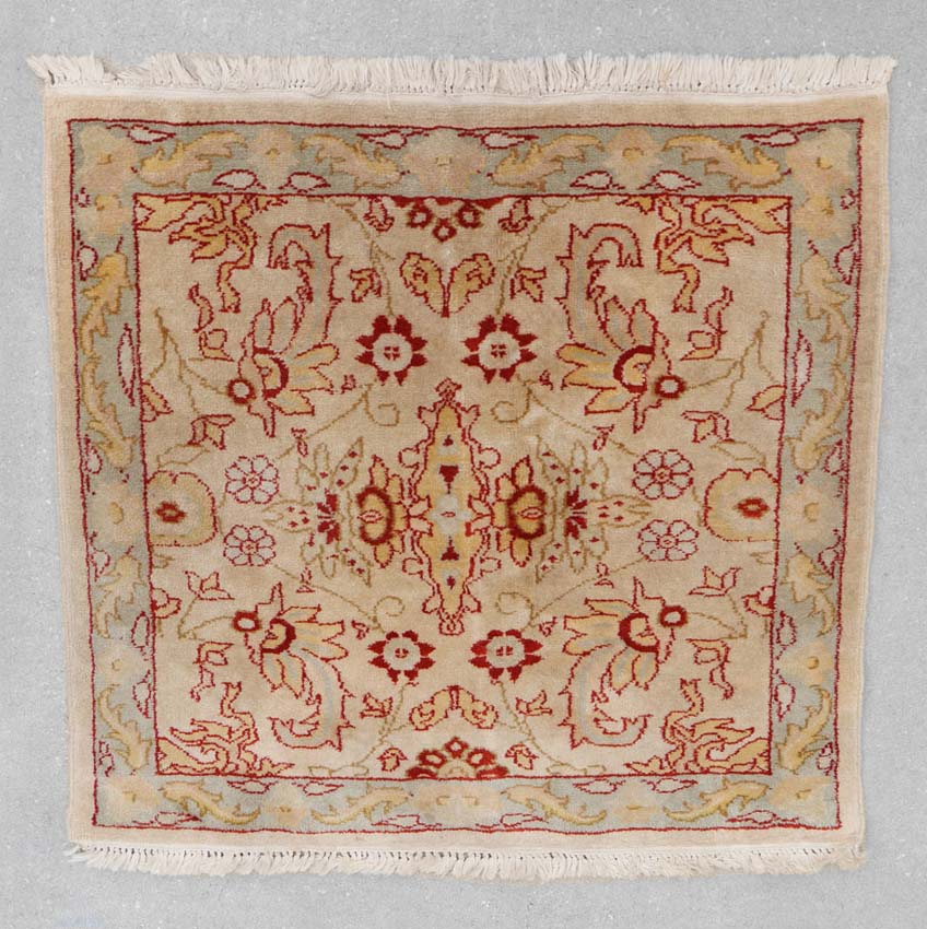 APPROX. 25 YEAR OLD PERSIAN HAND KNOTTED WOOL RUG, 3'2'' / 3'4'' x 3'1'': This small ivory ground mat has a soft pastel color palette that is accentuated by the outline of motifs with burgundy. This would make a nice entry way piece. Condition is good.