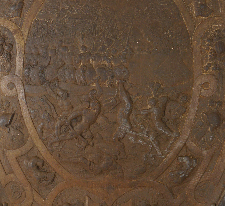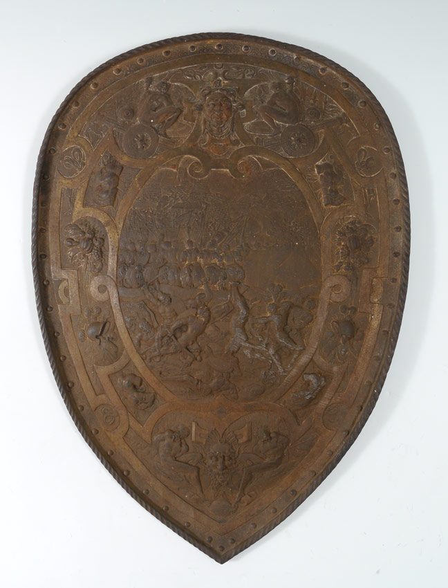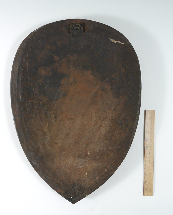 NEOCLASSICAL CAST IRON SHIELD: Wall mounted shield form plaque with neo-classical Greek warfare motifs. Measures 24 3/4'' h. x 17 1/4''.