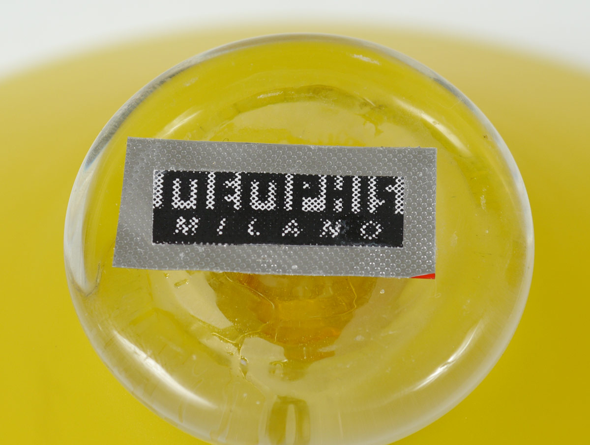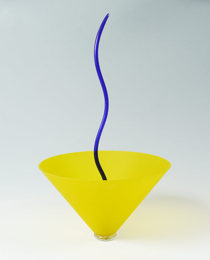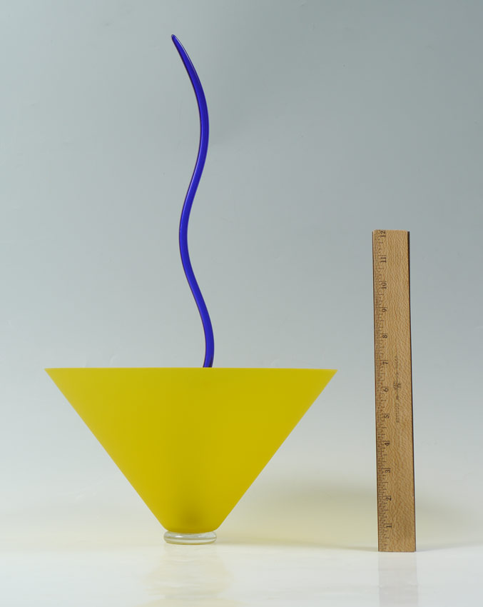 ANDREA ANASTASIO MEMPHIS ART GLASS VASE: Unsigned, yellow vase with removable blue glass accent in center. Original Memphis, Milano foil label on base. Vase 6 3/4'' h., overall 20'' h. x 11 1/2''.