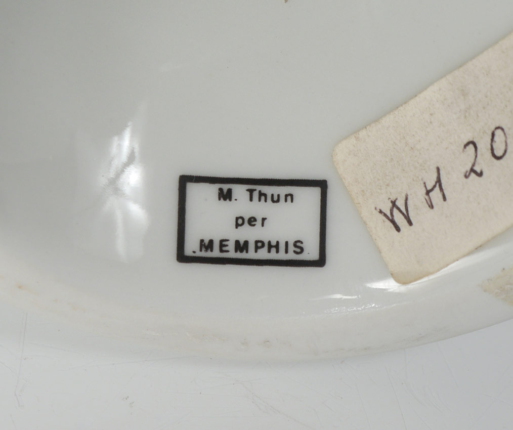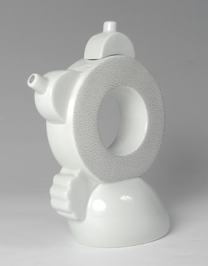 MATTEO THUN MEMPHIS CHAD CERAMIC TEAPOT: Lidded teapot with open circular center, design by Matteo Thun for Memphis. Stippled design on sides. Marked M. Thun per Memphis. Removable lid. 11 1/4'' h. x 9''.