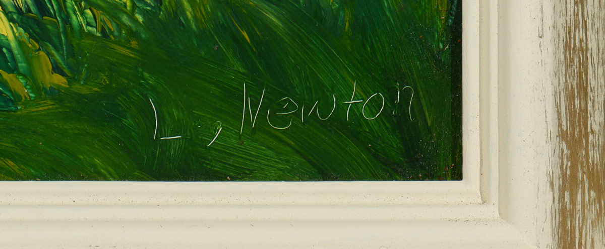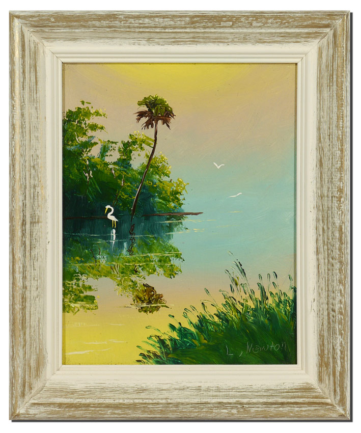 NEWTON, Lem, (American, 20th Century): Florida Highwaymen backwaters landscape with 3 birds, Oil/Masonite, 14'' x 11''. Painted wood molding frame, 18'' x 15''.