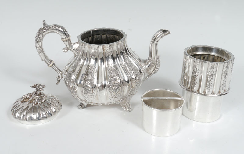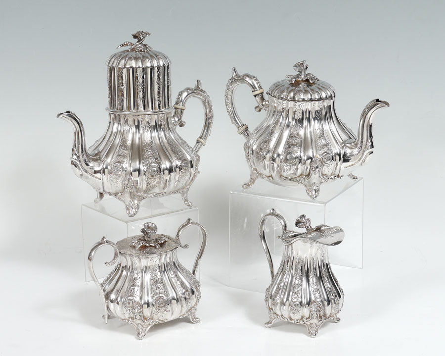 HIGHLY ORNATE VICTORIAN SILVERPLATE TEA SERVICE: Marked Superior Electro Plate, 5 pieces total to include 1) Coffee pot with removable lid and insert, floral finial. 10 1/2'' h. x 10 3/4''. 2) Teapot with hinged lid, floral finial. 7 1/2'' x 11''. 3) Covered sugar with hinged lid, floral finial 5 1/2'' h. x 7 1/2''. 4) Covered creamer with hinged lid, partial floral finial, 6 3/8'' h. x 5 3/4''. 5) Sold with a non matching tray with embossed and reticulated rim, engraved center. 1 1/8'' h. x 15 1/2'' square.