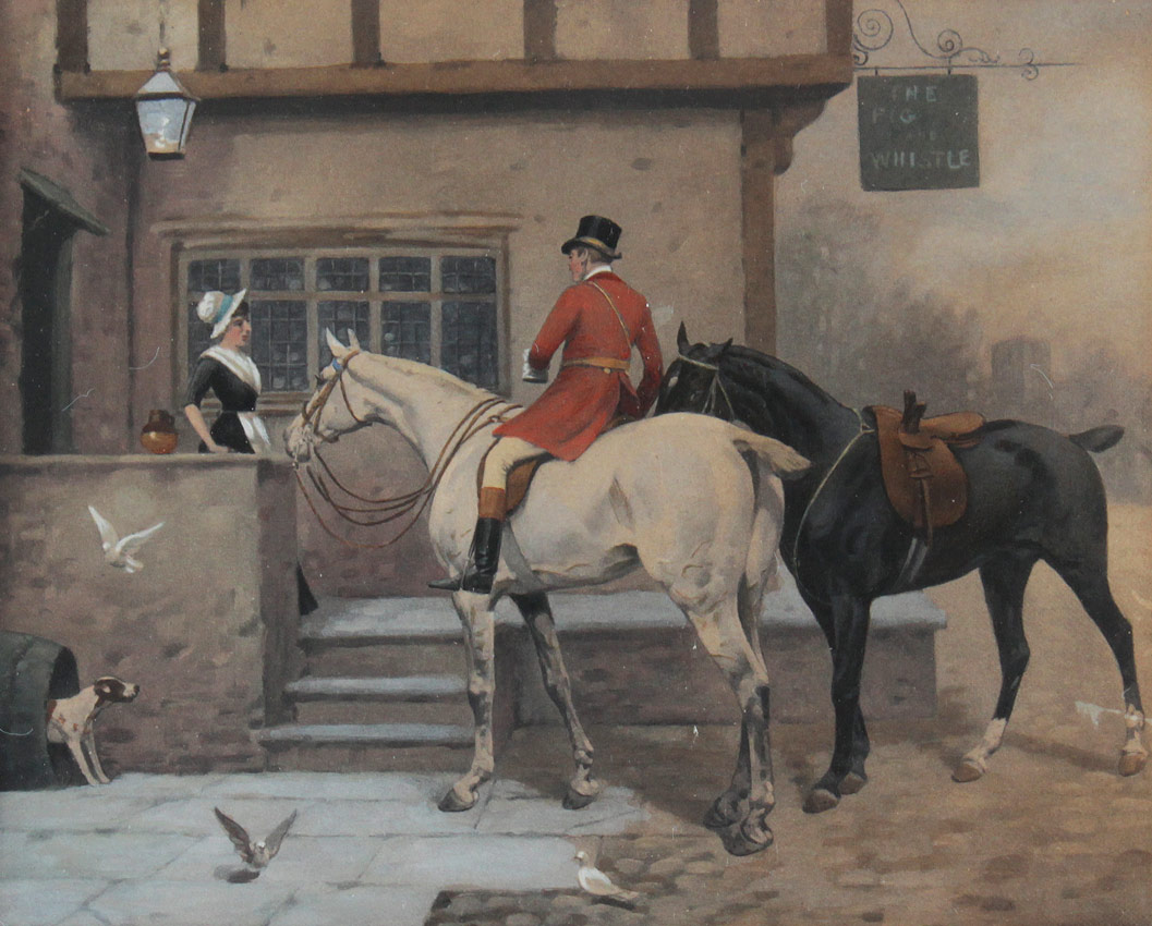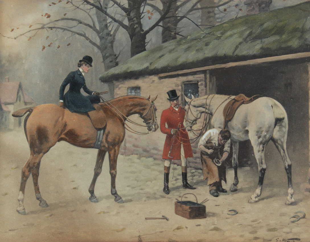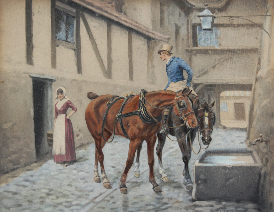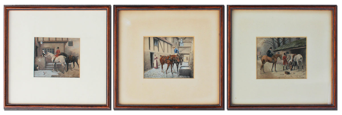 WRIGHT, George, (British, 1860-1942): 3 Watercolor/Gouache, Genre Scenes, Horses and Stables, Sight size, 4 1/4'' x 5 1/4'' each, framed separately under glass, 10 3/4'' x 12'' each.