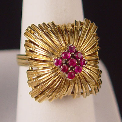18K RUBY RING: 18K yellow gold ring contains 9 round native cut rubies, approx. .40 Ctw. Rated SI in clarity (Type II), stpR in Hue, 4-5 in Tone and 4-5 in Saturation. The rubies are prong set. High profile. Weight: 8.8 grams. Size: 8.5