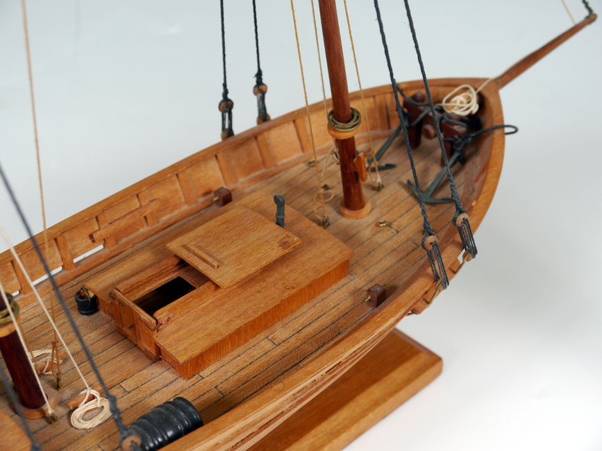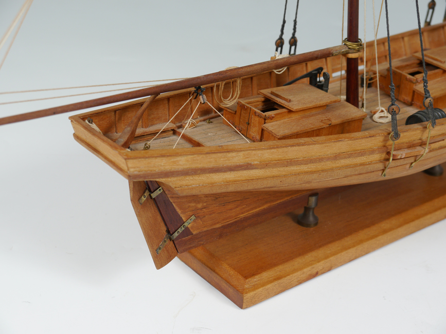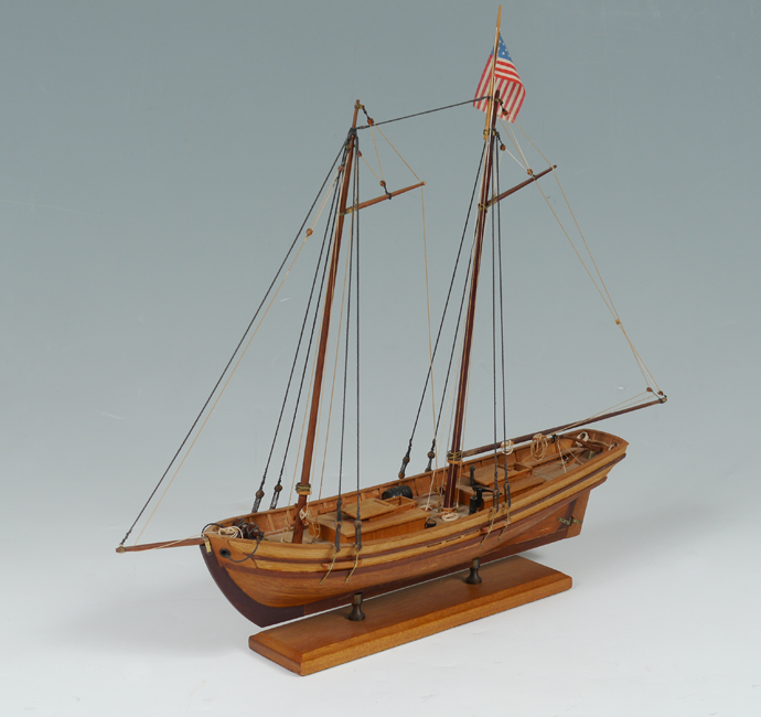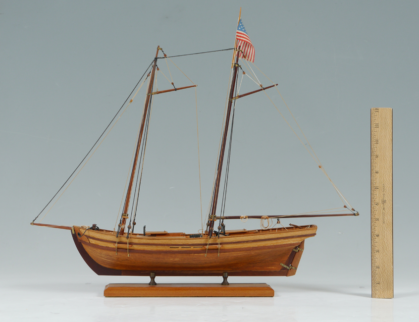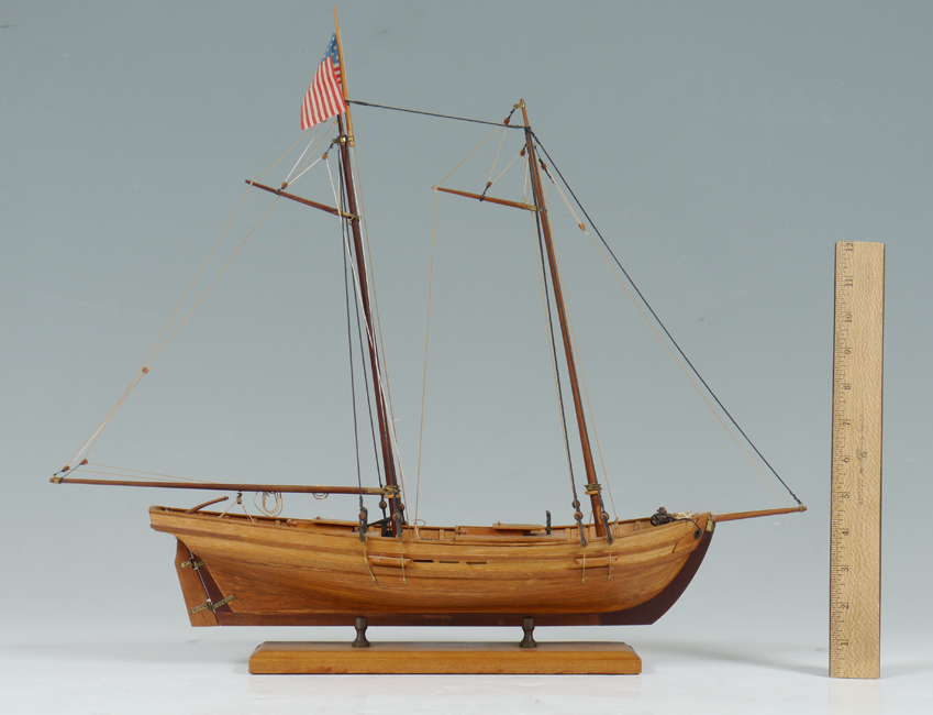 HANDCRAFTED SHIPS MODEL VIRGINIA PILOT BOAT KATIE: 2 mast ships model on stand. Overall 18 3/8'' h. x 21'' x 4 5/8''.