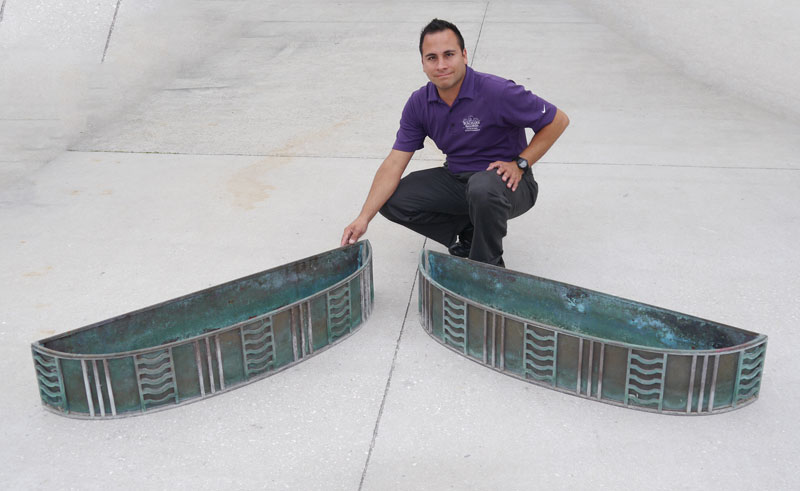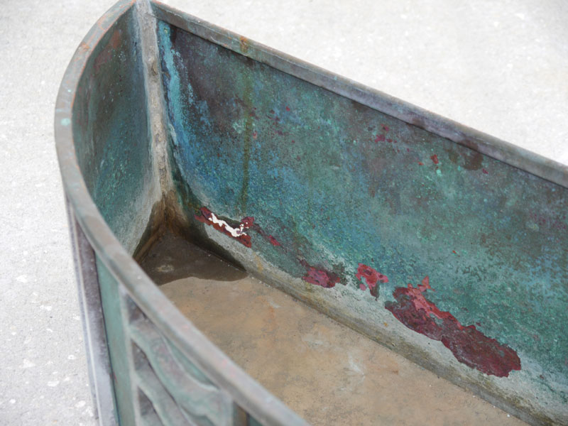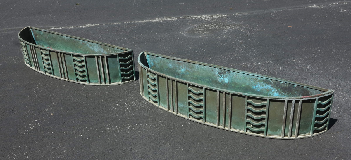 PAIR DECO COPPER & BRONZE GARDEN PLANTERS: Bronze frames with inset copper. Lovely patina. 9'' h. x 50'' x 11 1/2''