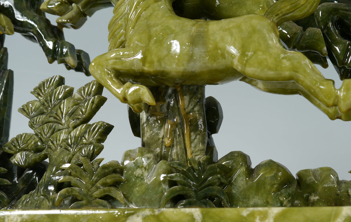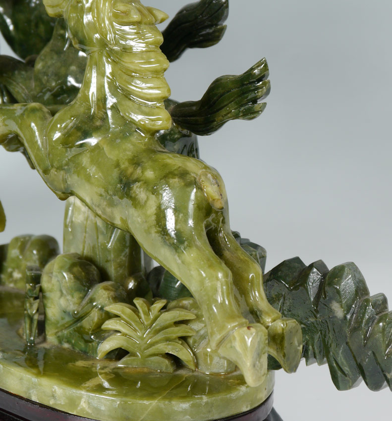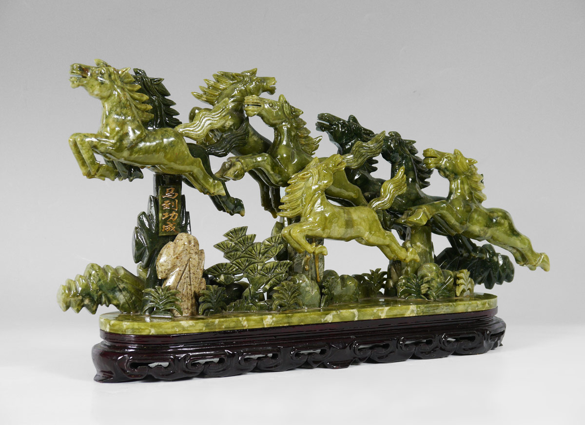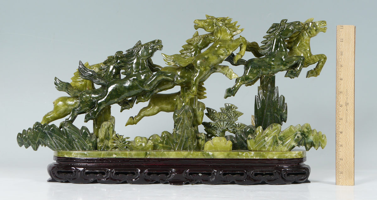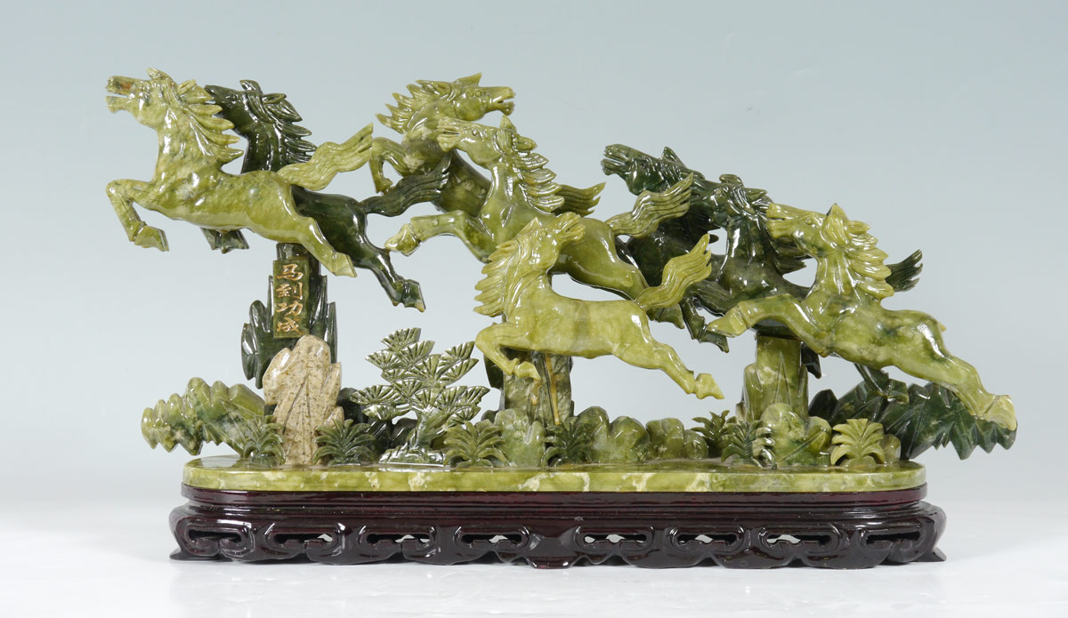 ORIENTAL CARVED STONE HORSE FIGURAL GROUP: Carved serpentine grouping of 8 horses, signed in characters on one support. Carved wood base. Overall measures 13 1/2'' h. x 24 1/2'' x 5''.