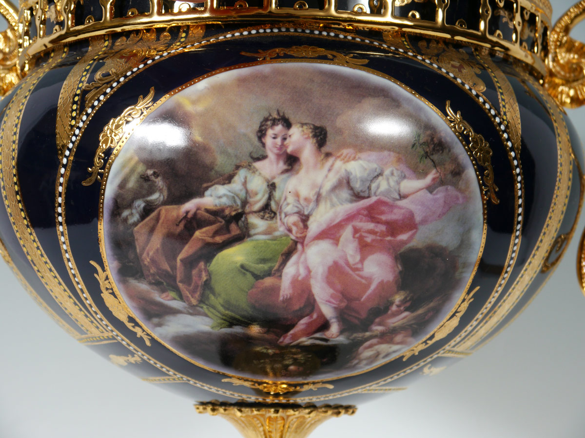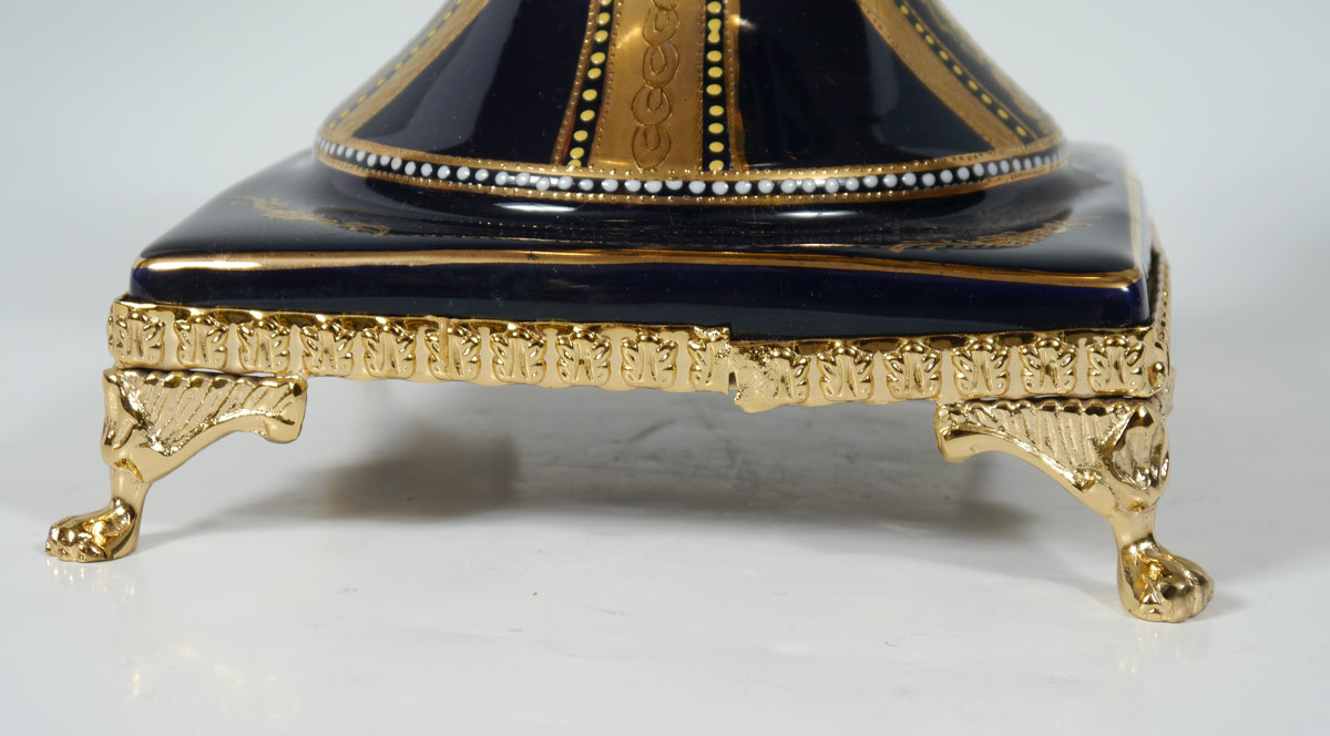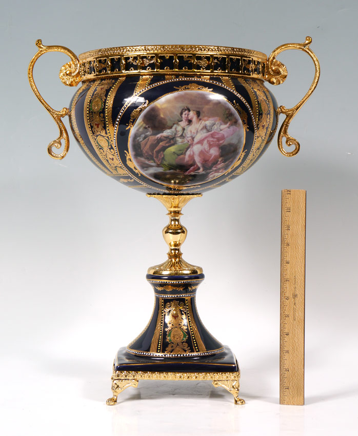 DECORATIVE LIMOGES JARDINIERE: Late 20th century, cobalt ground with gilt decoration. Transfer medallions with outdoor genre scene. Gilt metal mounts. Marked S. Limoges on base. 21'' h. x 17''.