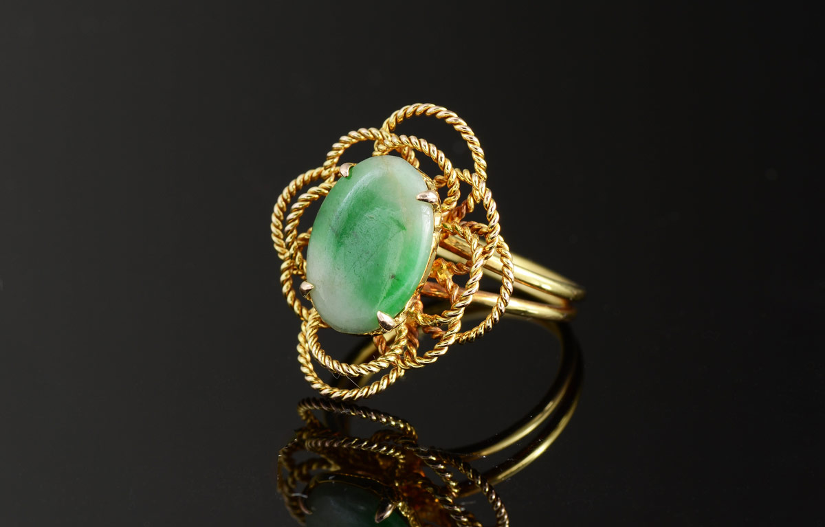 14K JADE RING: 14K yellow gold ring centers one 12.00 x 9.00 mm oval shaped piece of jadeite jade. Mottled green/white with heavy veining. Prong set. Weight: 5.0 grams. Size: 7.5