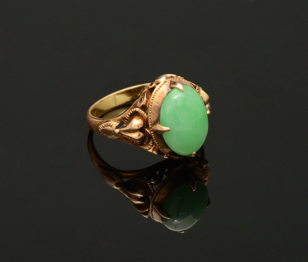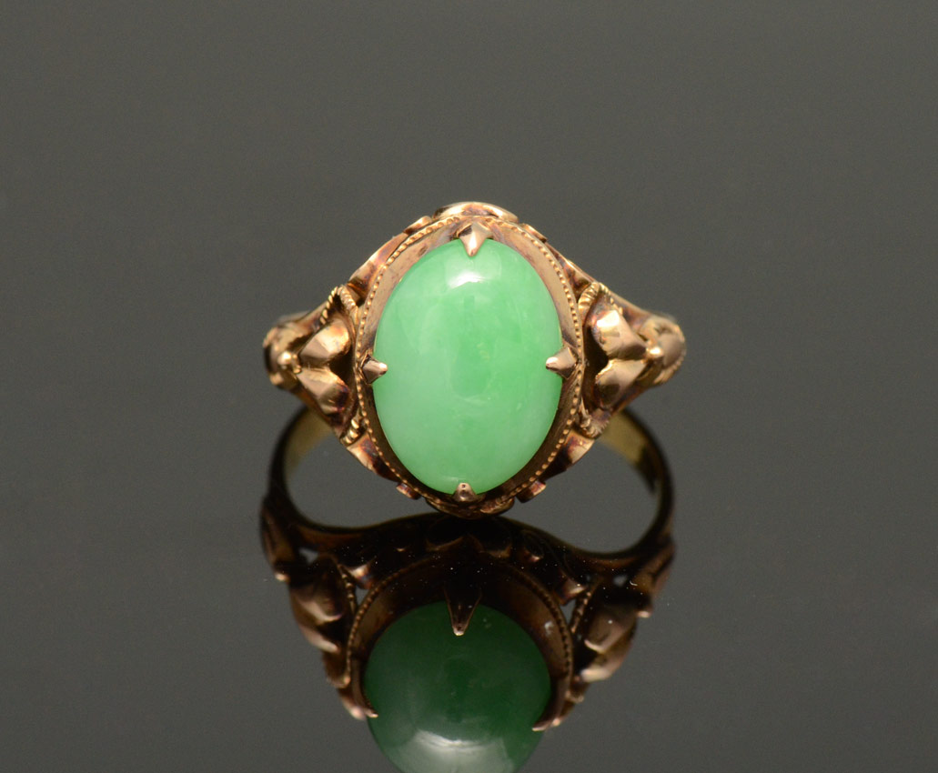 18K ARTS & CRAFTS JADEITE JADE RING: 18K yellow gold Arts & Crafts ring contains one 11.00 x 9.00 mm oval cabochon cut piece of jadeite jade. Green with slight mottling. The jadeite is prong set. Weight: 4.5 grams. Size: 7