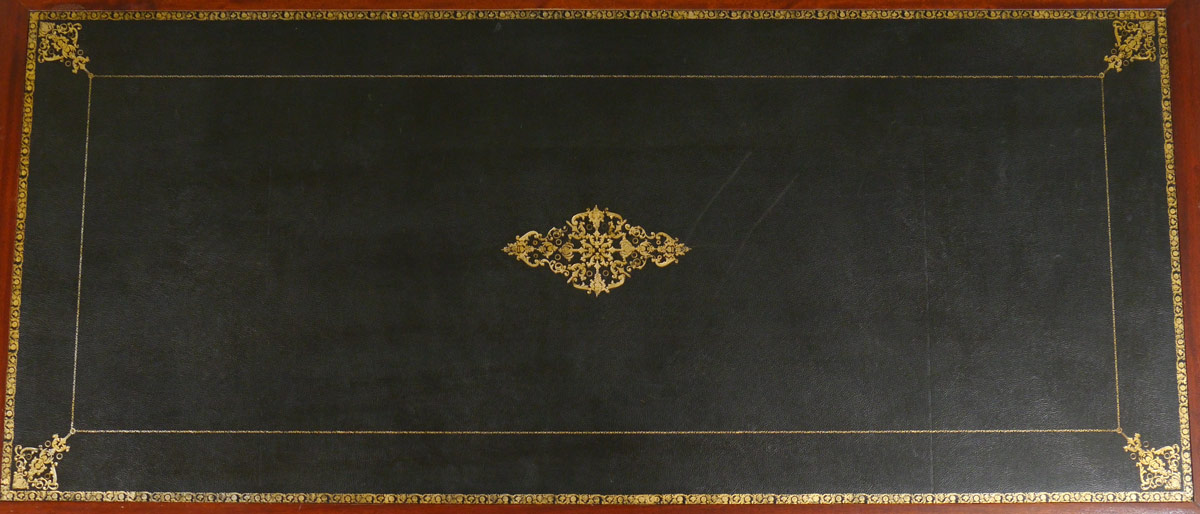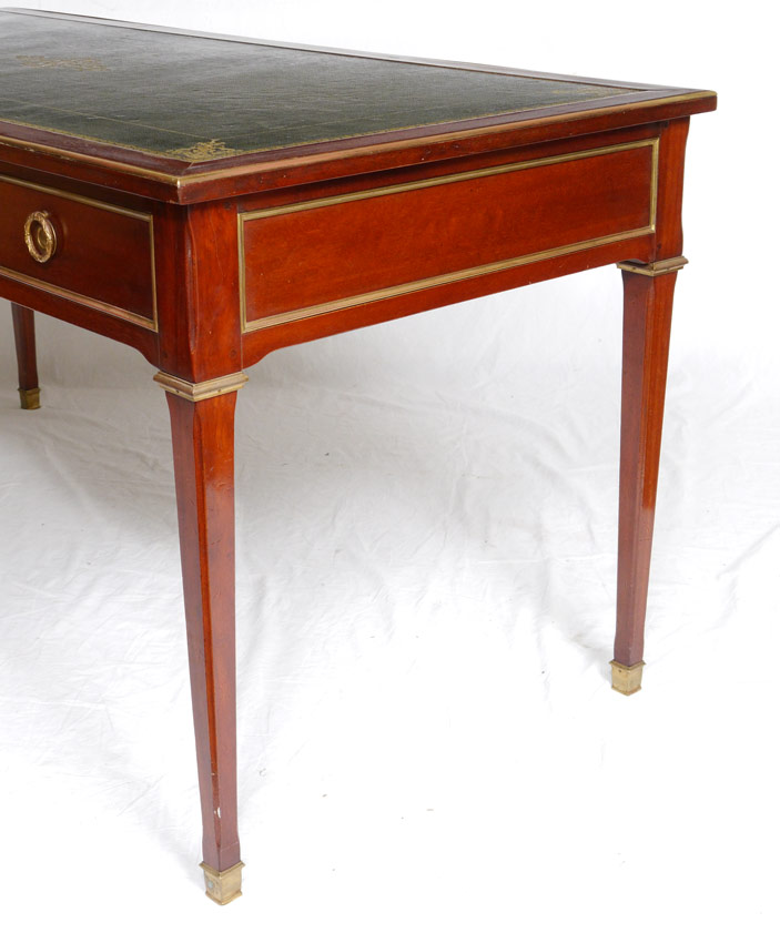 FRENCH STYLE BUREAU PLAT DESK: Inset embossed leather top with brass trim. Central drawer with 2 shaped front side drawers, tapered legs. 30 1/2'' h. x 62 1/2'' x 29 1/4''.
