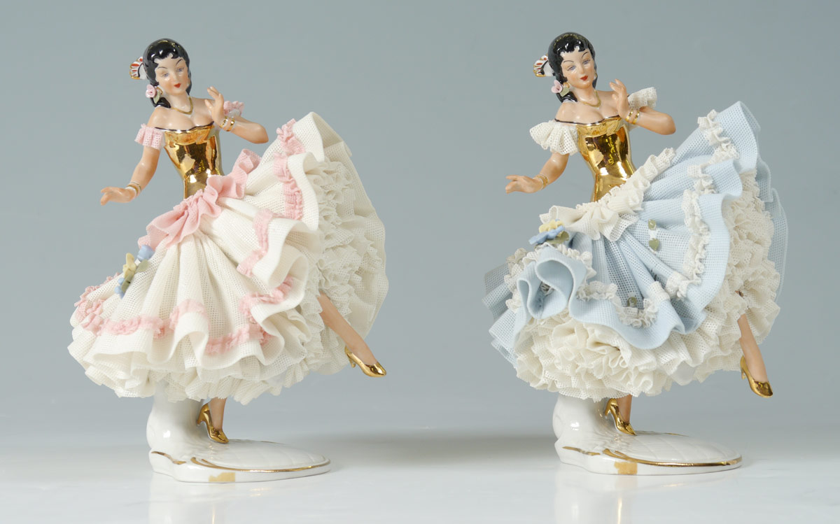 TWO DRESDEN LACY FIGURINES: 6 3/4'' h. x 5 1/2''.
