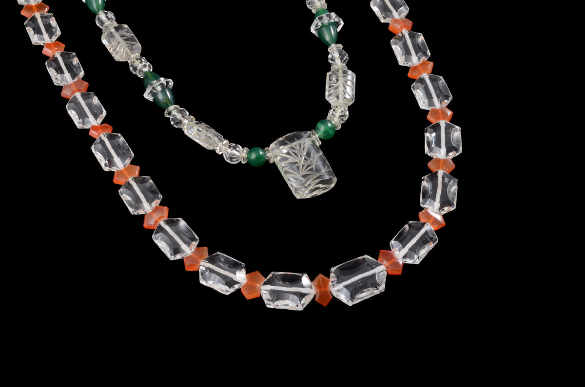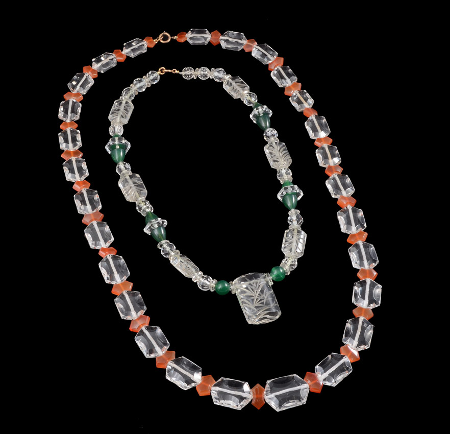 TWO 1920'S ROCK CRYSTAL NECKLACES: 1) Faceted crystals alternating with carnelian, length 30''. 2) Etched and faceted crystal interspersed with chrysoprase, 18''. Both necklaces have recently been restrung.