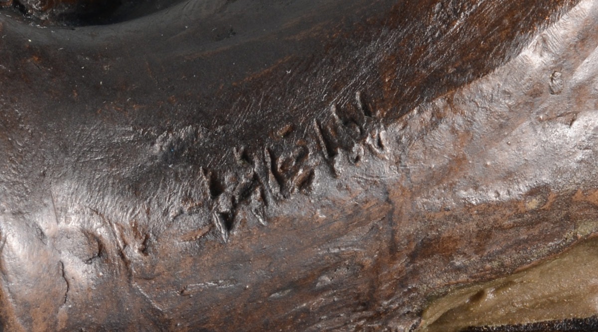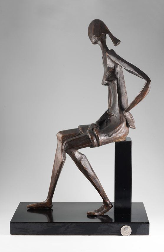 MODERNIST SCULPTURE SEATED GIRL SIGNED HEIM: Glazed clay like medium giving a Bronze like patina, 17 1/2'' h. x 10'' w. x 7'' d.