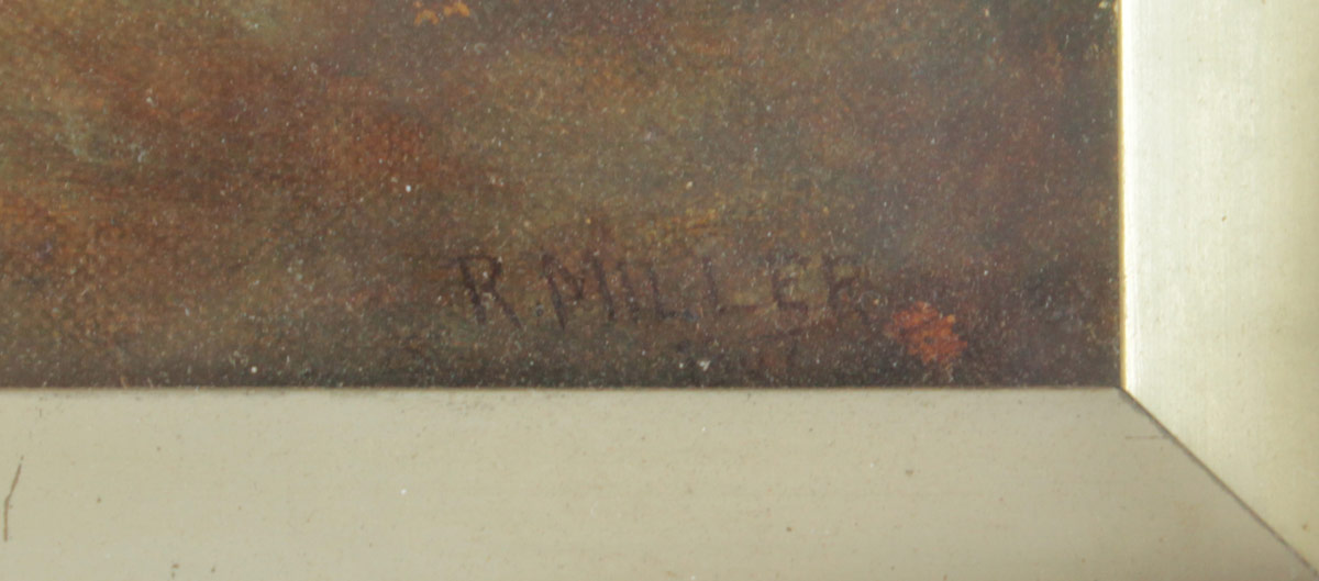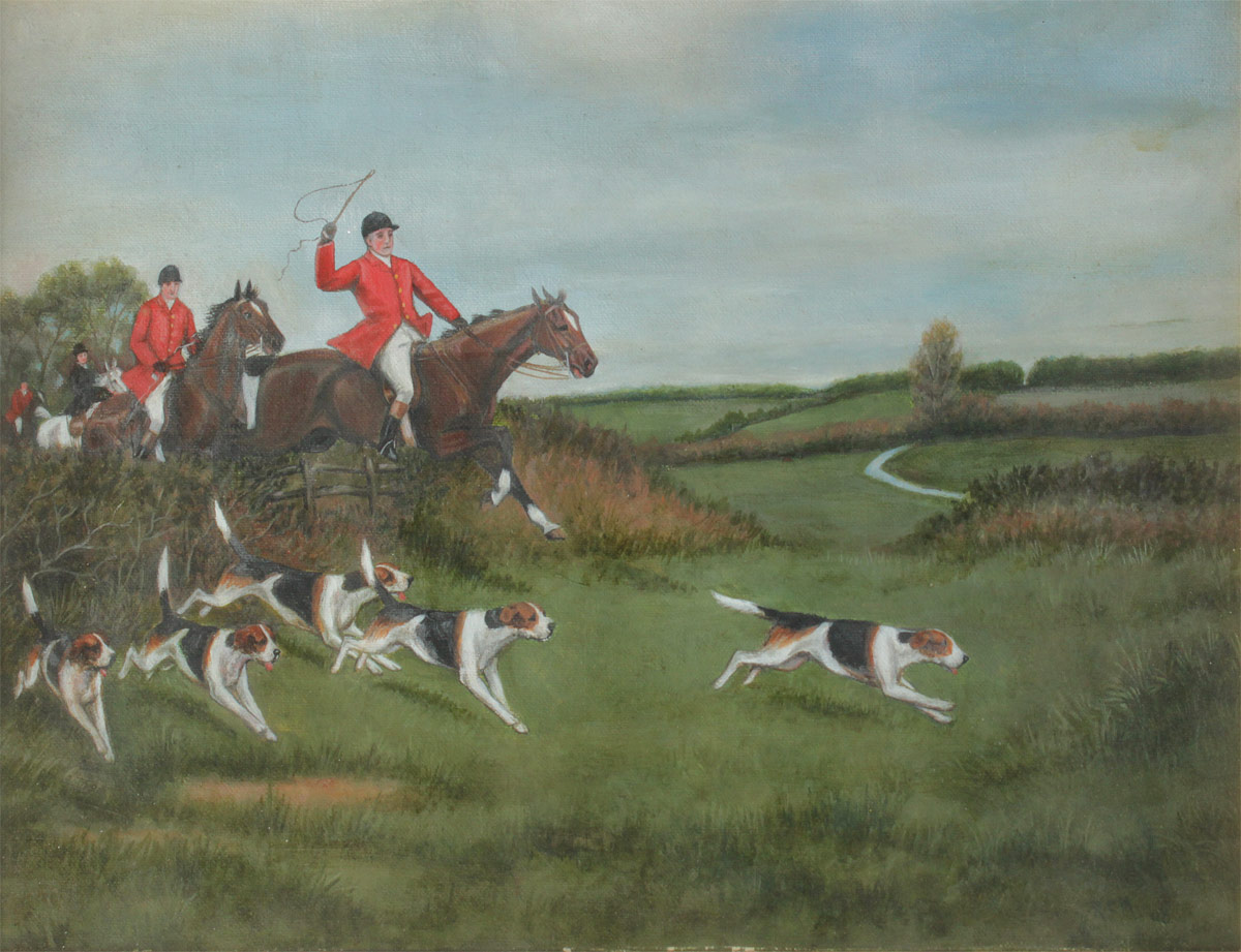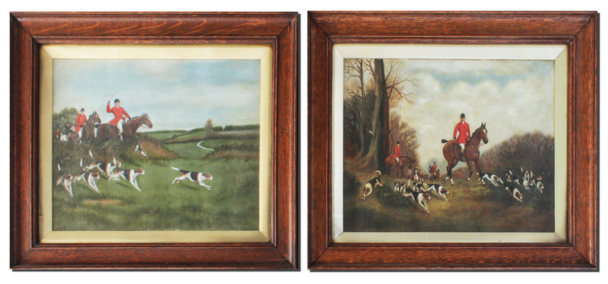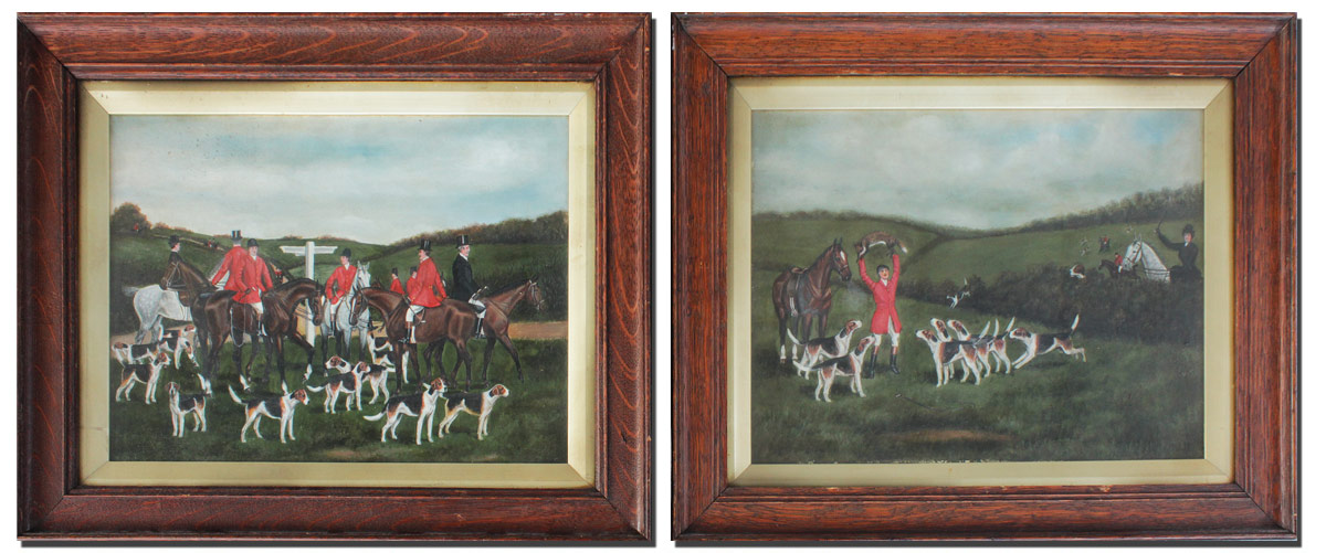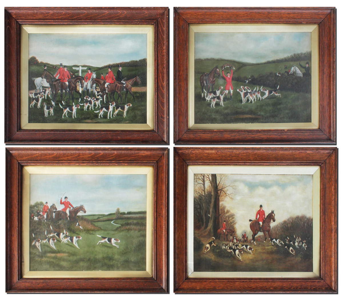4 PIECE HUNT SCENE PAINTING LOT AFTER ROY MILLER: 1) ''The Gathering'', Oil/Panel, signed RCM lower right, 13 1/4'' x 17 1/2'', encased in antiqued oak frame, under glass, 16'' x 21''. 2) ''The Chase'', Oil/Panel, signed RCM, dated lower right, 13 1/4'' x 17 1/2'', encased in antiqued oak frame, under glass, 16'' x 21''. 3) ''Going to Ground'', Oil/Panel, signed RCM lower right, 13 3/4'' x 17 1/2'', encased in antiqued oak frame, under glass, 16'' x 21''. 4) The Kill'', Oil/Panel, signed RCM lower right, 13 3/4'' x 17 1/2'', encased in antiqued oak frame, under glass, 16'' x 21''.