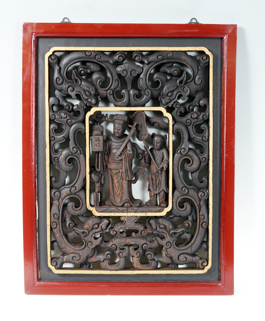 ORIENTAL CARVED PANEL: Deep, deep pierced carving with central medallion of 2 figures, framed with 4 writhing dragons. Red lacquer frame. Overall 23 5/8'' x 25 1/2'' x 1 1/4'' deep.