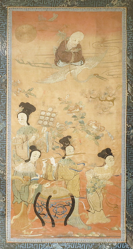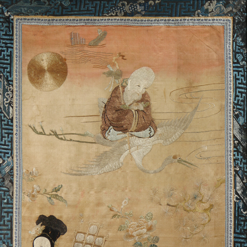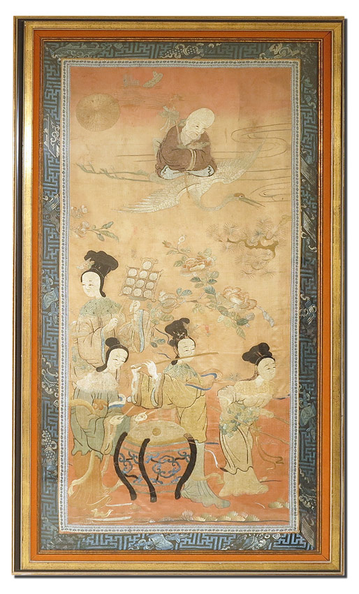 5 FT TALL CHINESE SILK EMBROIDERY: 19th C embroidery depicting a spirit riding a crane, over a group of women. The border is a rich blue with an iridescent quality. Framed under glass. Measures 60'' tall x 31'' overall.