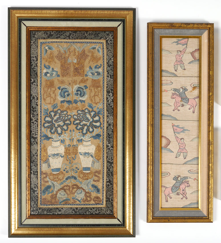 GROUP OF CHINESE SILK EMBROIDERIES: All framed under glass. Featuring a depiction of mirror images with metallic threads, 27'' x 15 1/2''. A woven picture of boys with banners and horses, 24'' x 8''. An elongated panel with figures, 26 1/2'' x 10''. And a pair of silk abstracts, 8 3/8'' x 12 1/8''. All measurements include the frames.