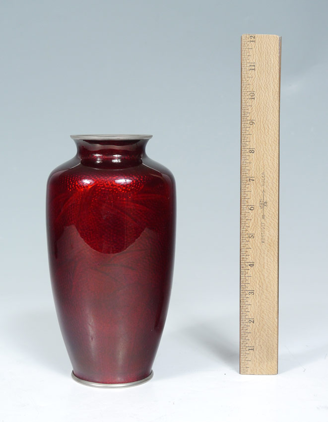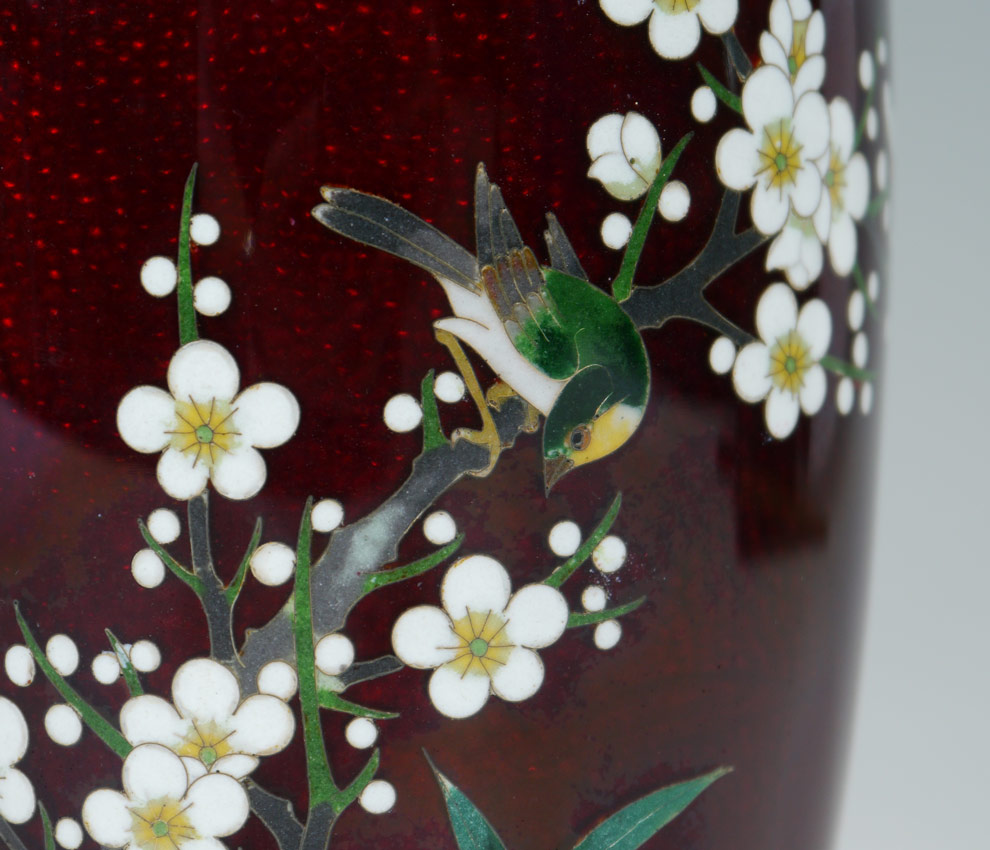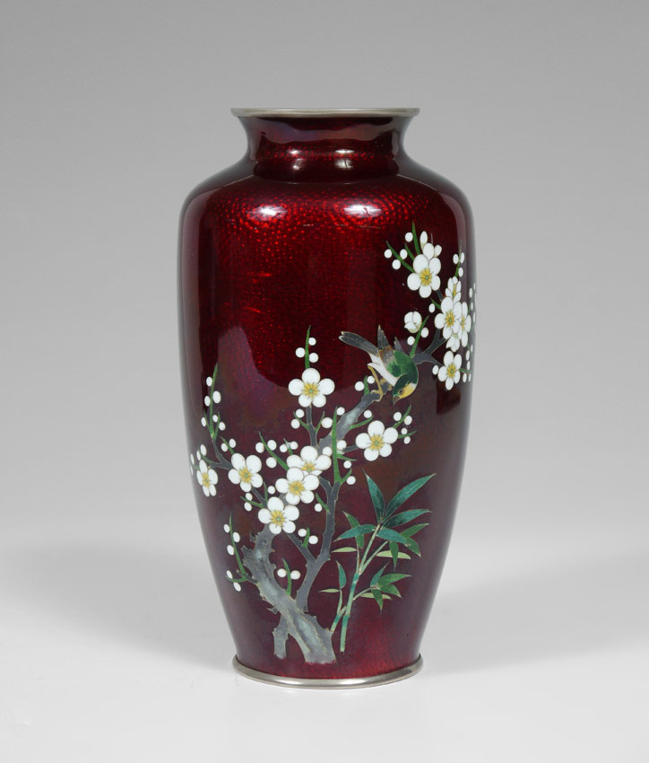JAPANESE CLOISONNE VASE: Floral motif with song bird on red ground, silvered mounts. Unsigned. 8 1/2'' h. x 4 1/2''. Sold with carved stand, 1'' h. x 3 3/4'' dia.