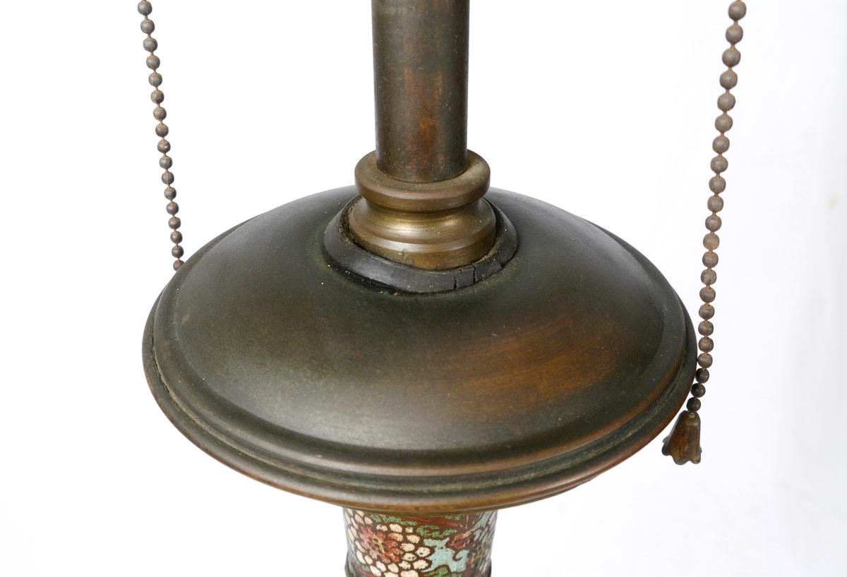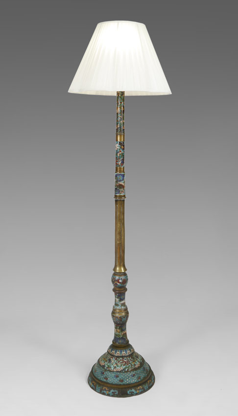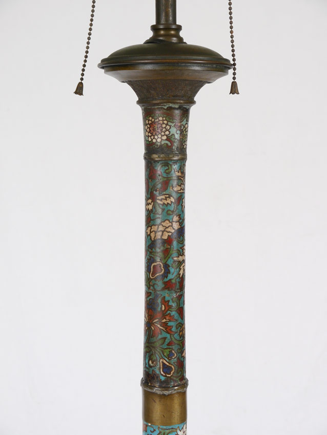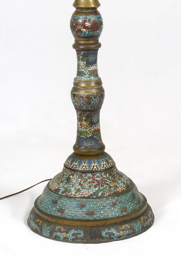 CHAMPLEVE FLOOR LAMP: Brass body with floral cloisonne embellishments in rings around shaft and base. Double light fixture. Sold with cloth shade. Overall 67 1/2'' h. x 13'' dia., shade 12'' x 19 1/4''. Age unknown.