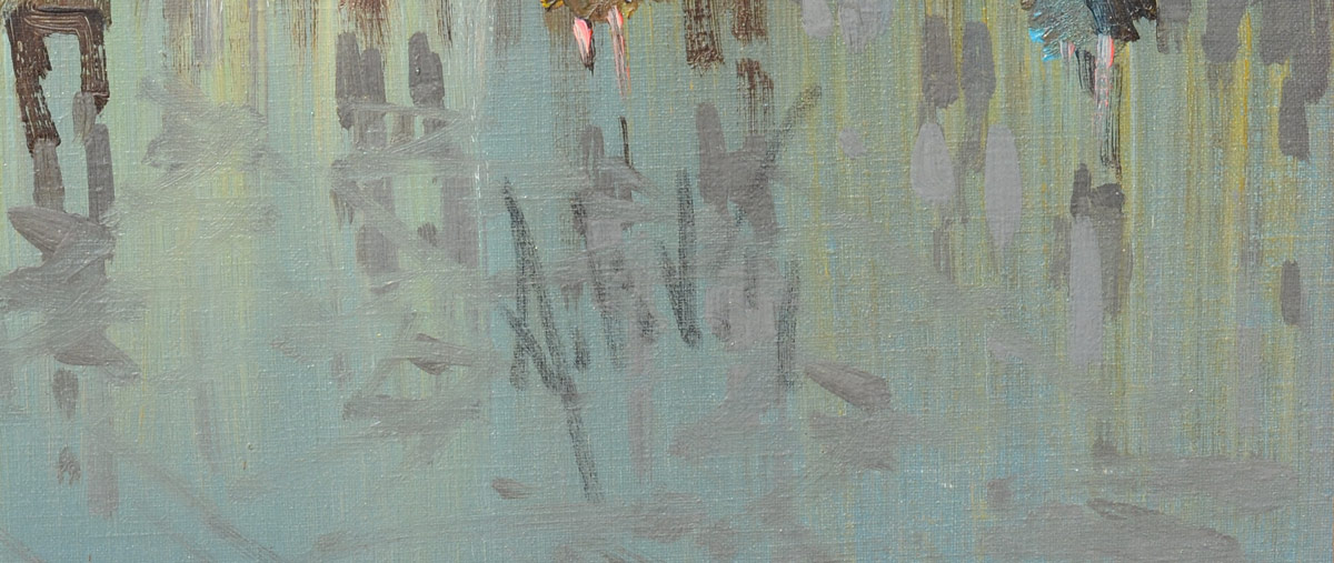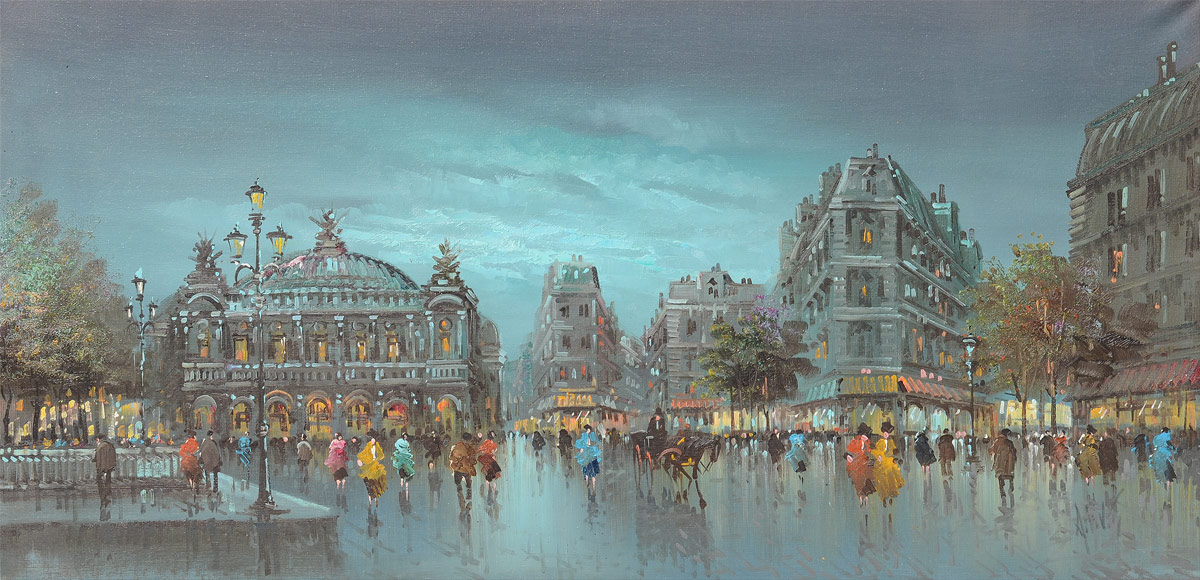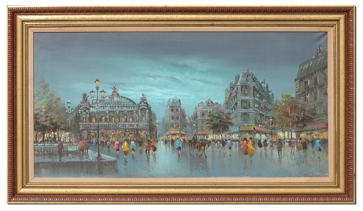 DEVITY, Antonio, (Italian, 1901-1993): Parisian Street Scene, Oil/Canvas, 24'' x 48'', signed lower right, Devity Studios Stencil on the canvas verso, encased in original gilded and painted frame, 32'' x 56''.