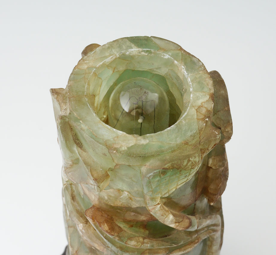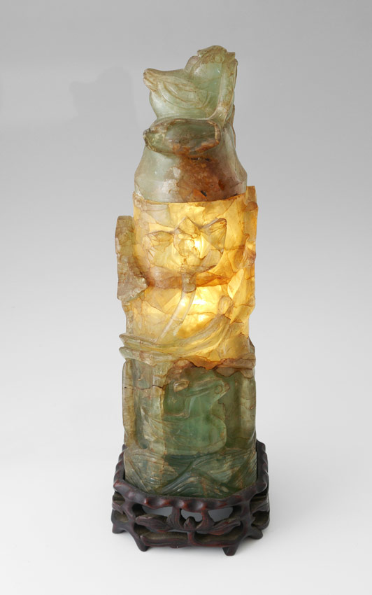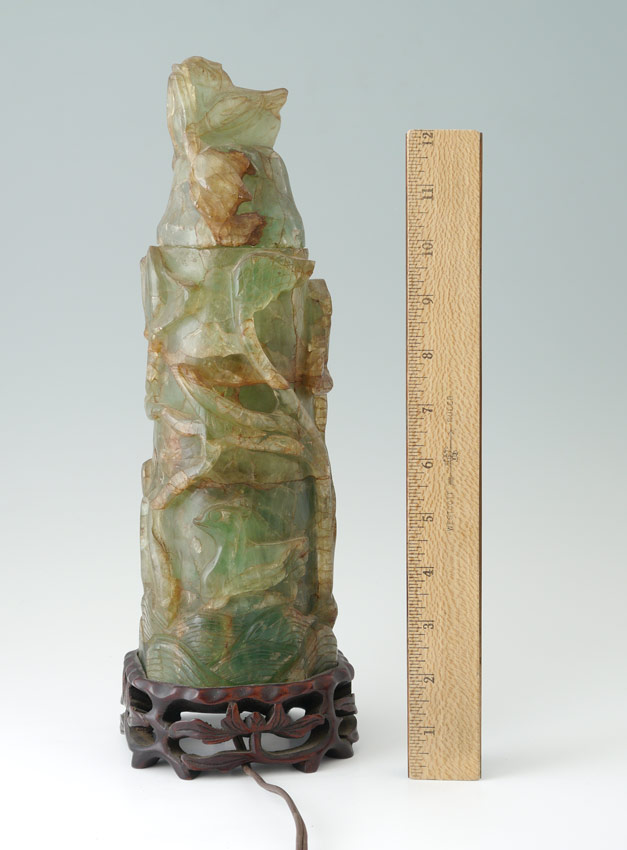 ORIENTAL CARVED GREEN FLUORSPAR LAMP: Bird adorned removable top. Carved body decorated in overall bird and vine design atop an open carved wooden pedestal. Overall measuring 13 5/8''h