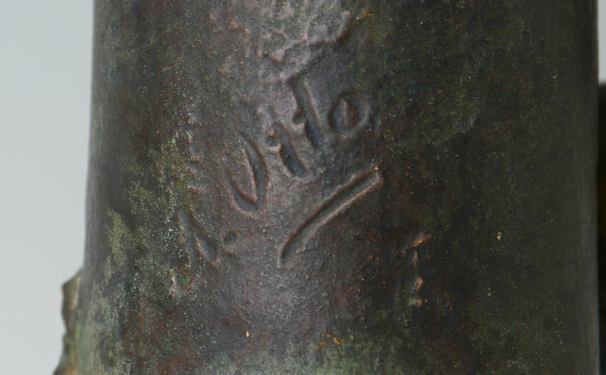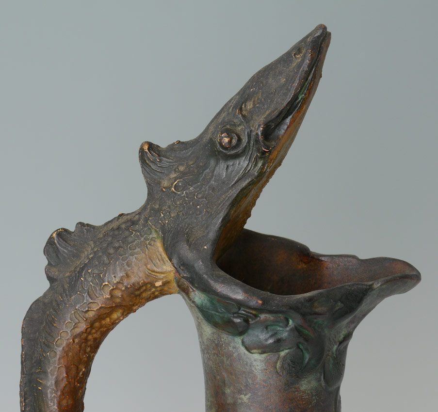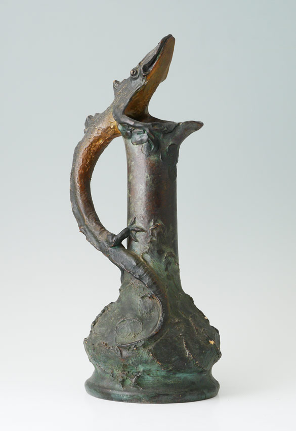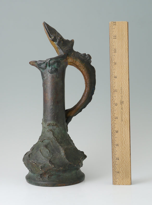 SIGNED JOHANN MARESCH ART NOUVEAU PITCHER: Ceramic pitcher with figural dragon form handle. Signed A. Otto for August Otto on neck, impressed JM? 1662. 12 1/4'' h. x 6 1/2''.
