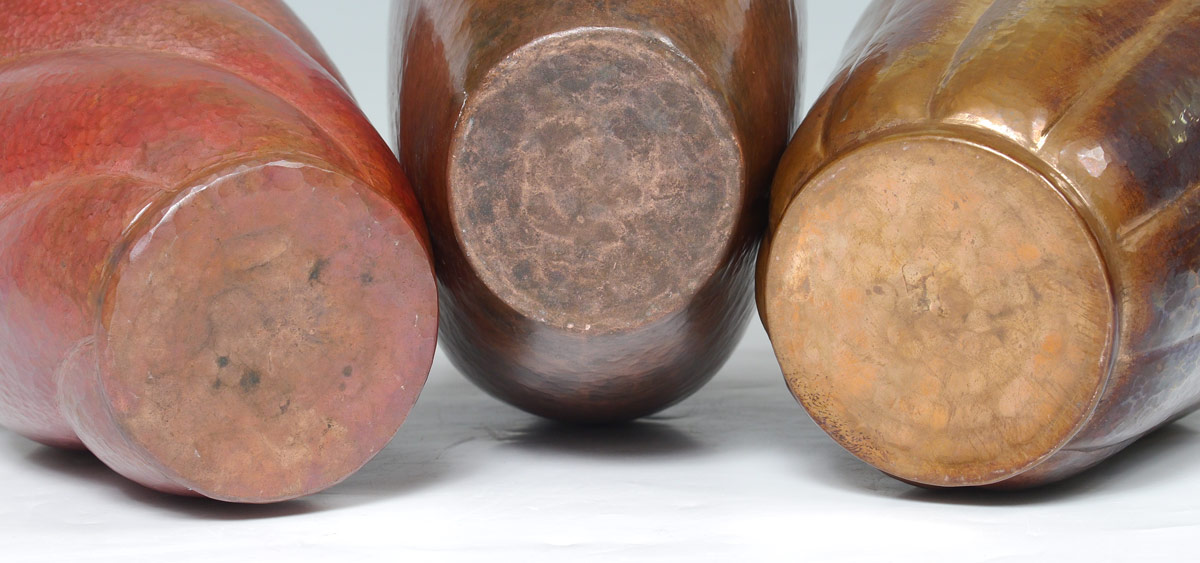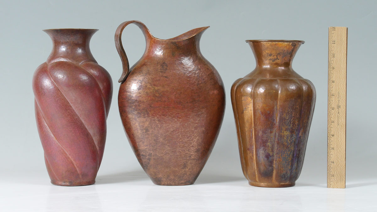 3 HAND HAMMERED COPPER VESSELS: 3 pieces total to include 1) Ribbed body with flared rim, 11'' h. x 6 1/2''. 2) Rose patina ribbed body with left twist, flared rim, 11 7/8'' h. x 6 1/2''. 3) Handled pitcher, 12 1/2'' h. x 8 3/4''.
