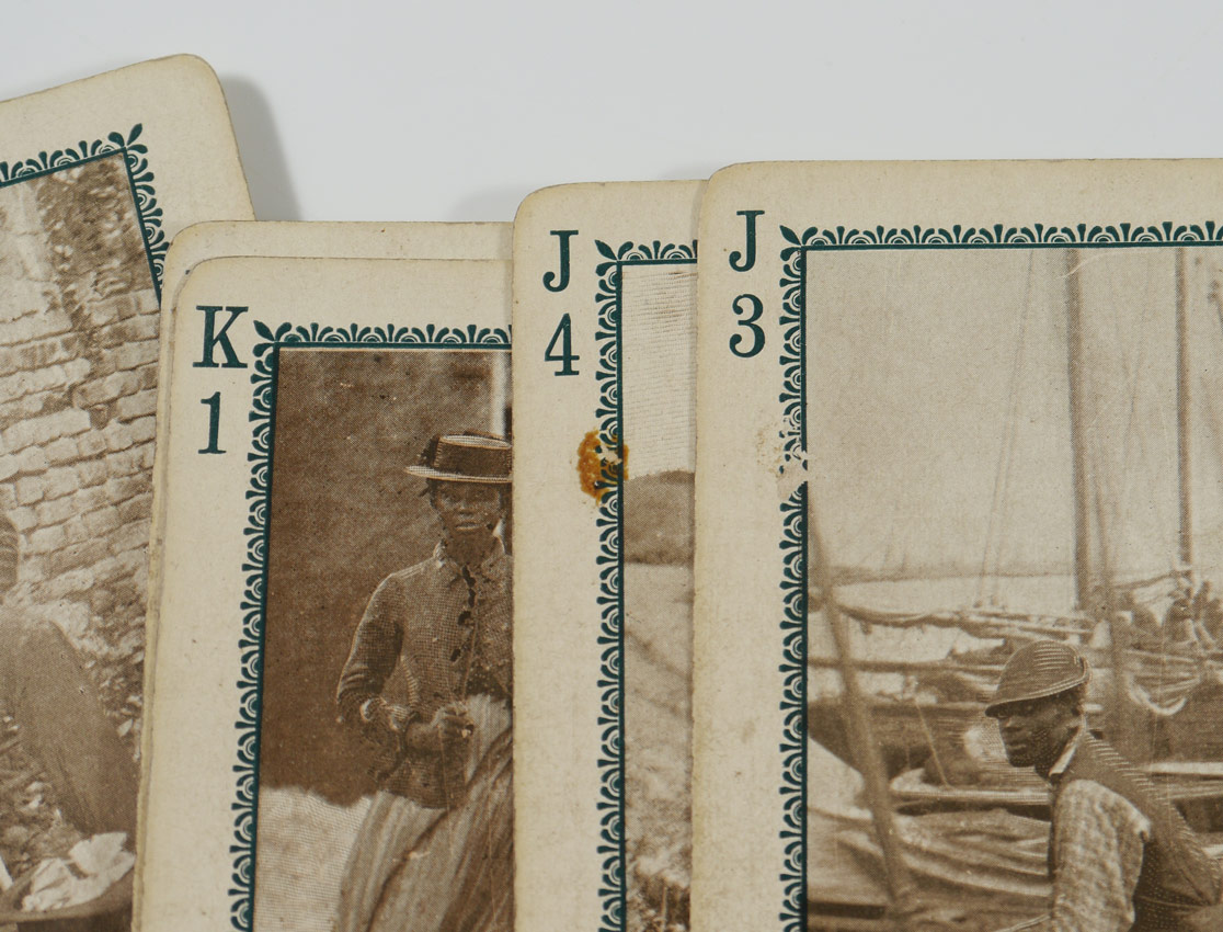 1897 GAMES IN DIXIE-LAND PLAYING CARDS: Produced by The Fireside Game Company, 1897. Cards portray scenes of Black Americana in the South of the time period. Complete set with A-1 through M-4 all present and original box.