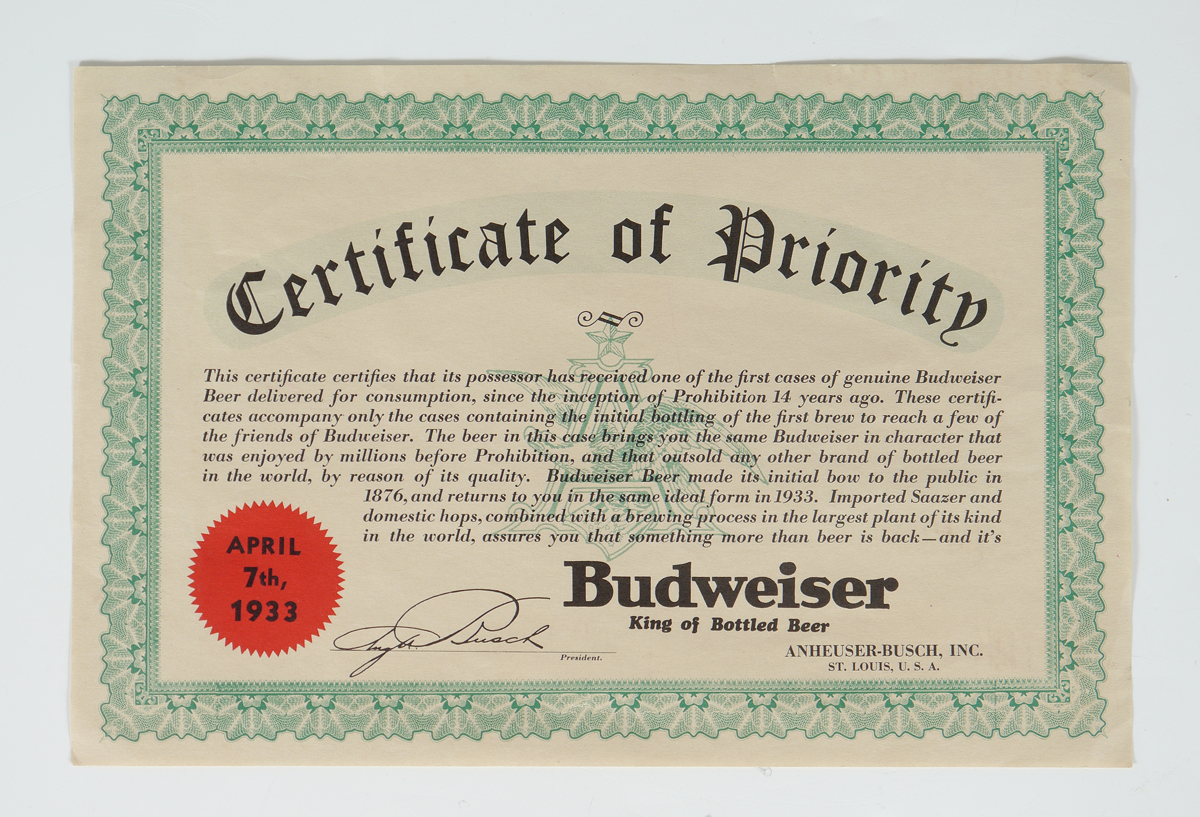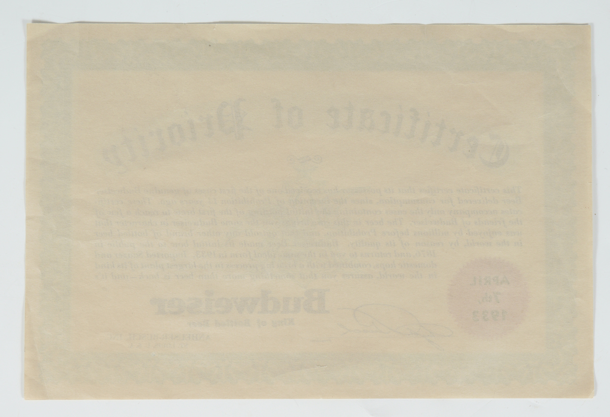 1933 BUDWEISER CERTIFICATE OF PRIORITY: Dated April 7th, 1933, certifies that the possessor has received one of the first cases of genuine Budweiser beer since the inception of Prohibition. 7'' x 10 3/8''.