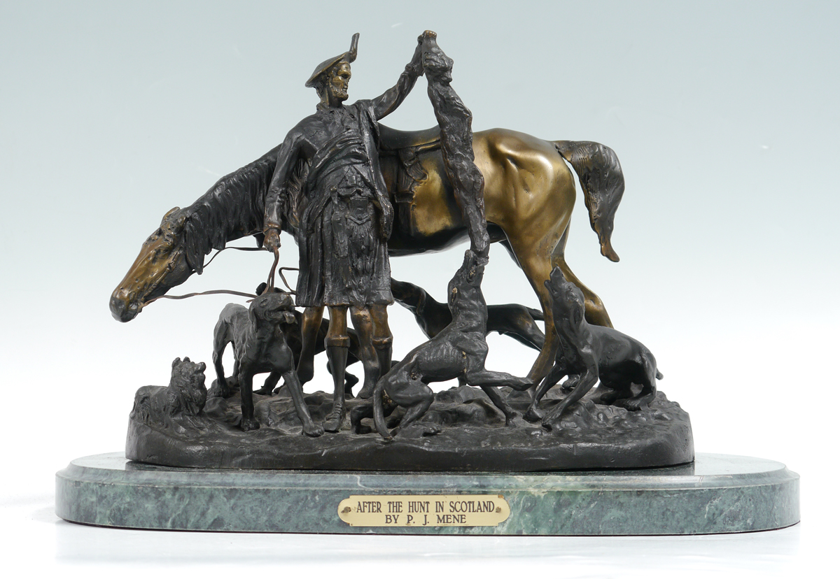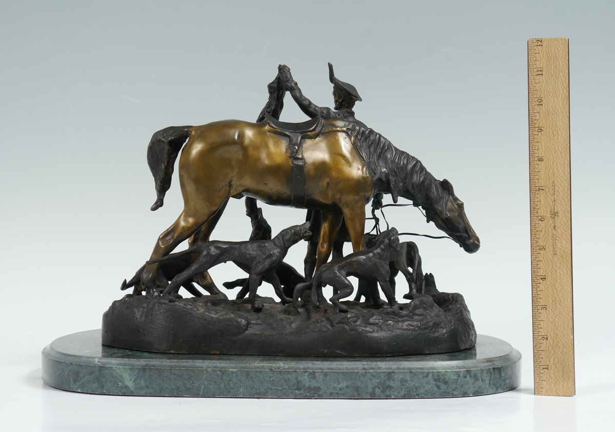 MENE, Pierre-Jules, (French, 1810-1879): Cast posthumously, After the Hunt in Scotland, Bronze finished metal, on marbleized plinth, 10 1/2'' h. x 14 1/2'' w. x 8'' d.
