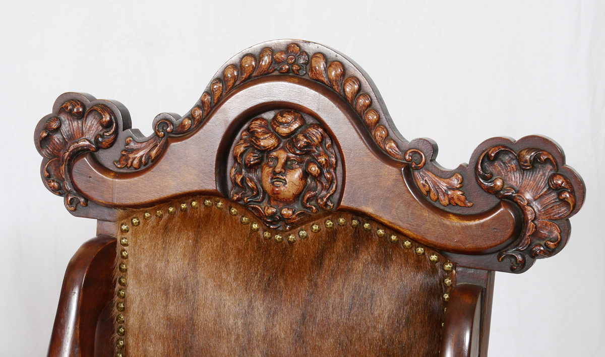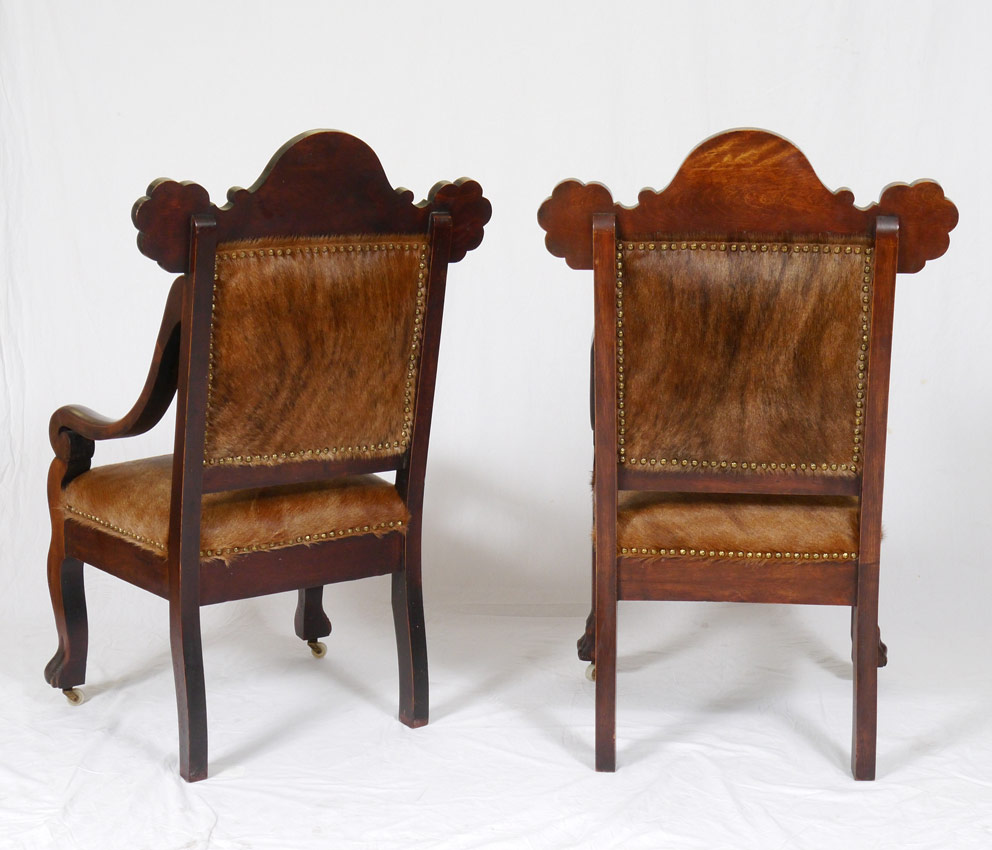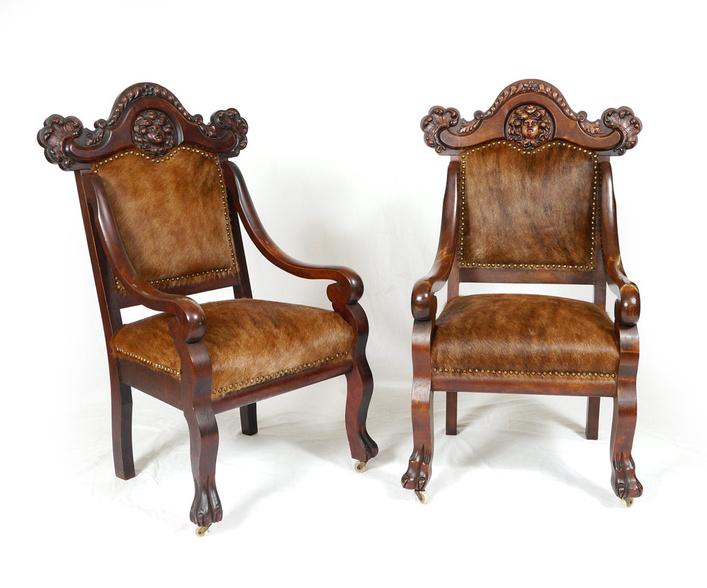 PAIR ROCOCO ARM CHAIRS: Recently upholstered in tacked cowhide, ornately carved top rail with figural masquerons. Shaped arms and support, front paw feet with castors. 40 1/2'' h. x 22 1/2'' x 23''.