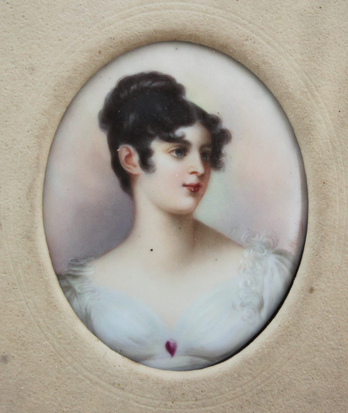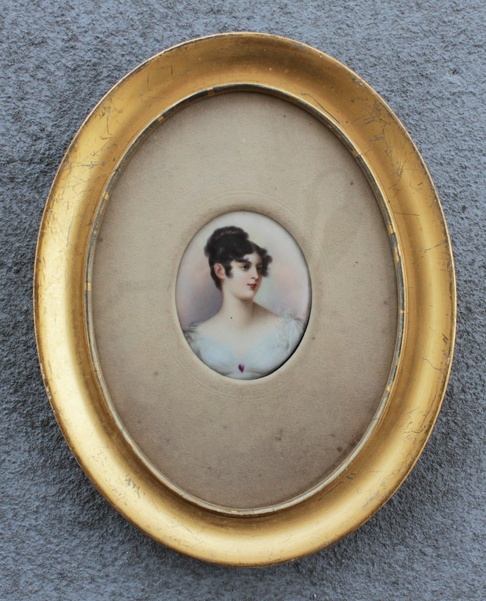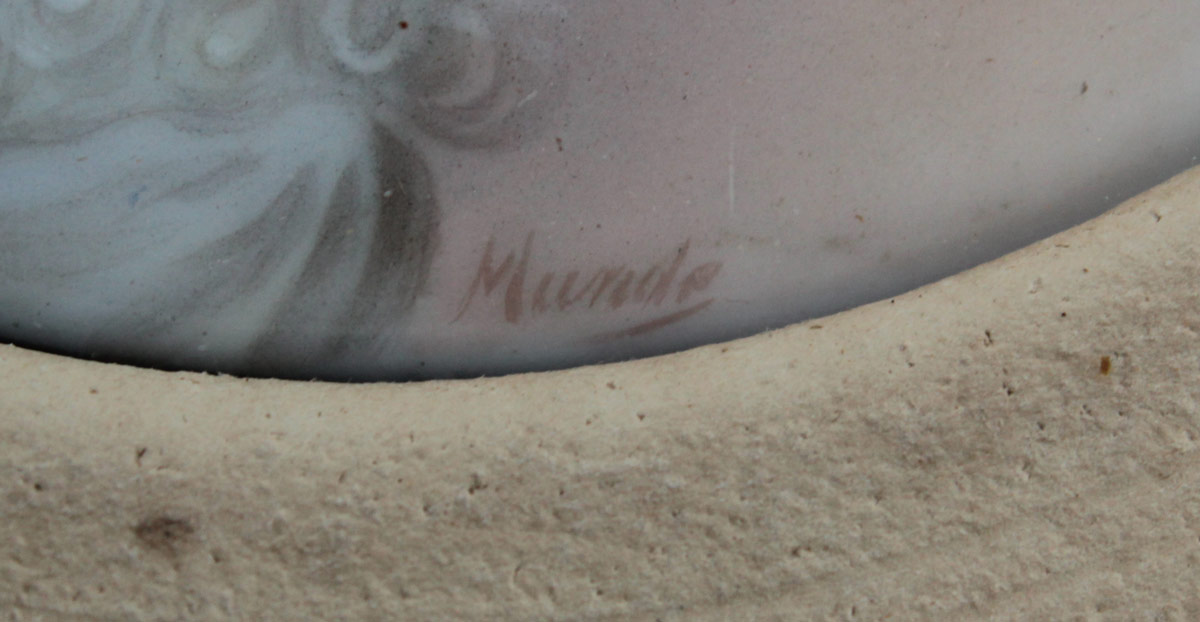 MINIATURE PORTRAIT PAINTING ON PORCELAIN SIGNED MUNDE: Oval measures 3 3/8'' x 2 5/8'', impressed numeral marking verso, encased in a worn gilded oval frame 9 1/2'' x 7 1/2''.