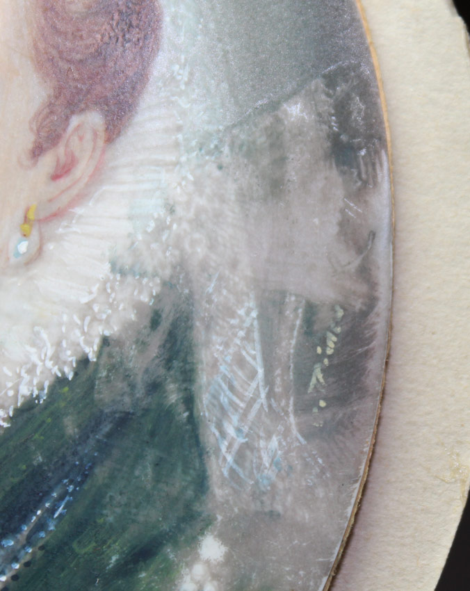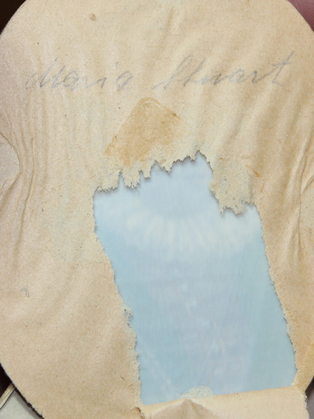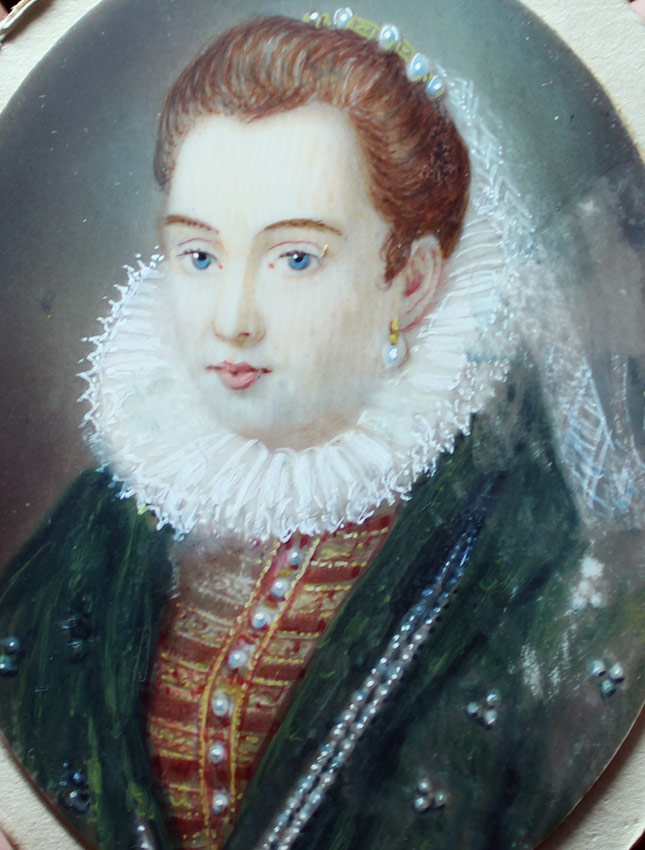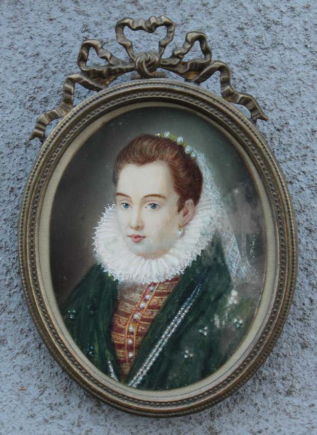 MINIATURE PORTRAIT PAINTING ON IVORY OF MARIE STUART: Oval 3 3/8'' x 2 1/2'', illegibly signed in the left margin, titled verso, encased in a gilt metal easel back frame with ribbon cartouche, 4 3/4'' x 3 1/4''.