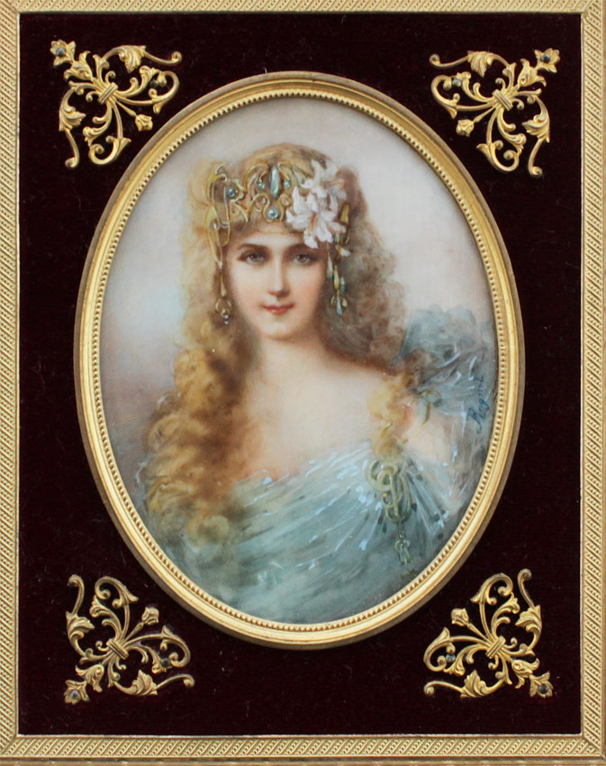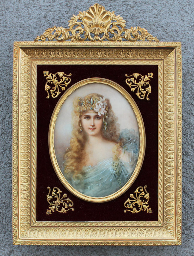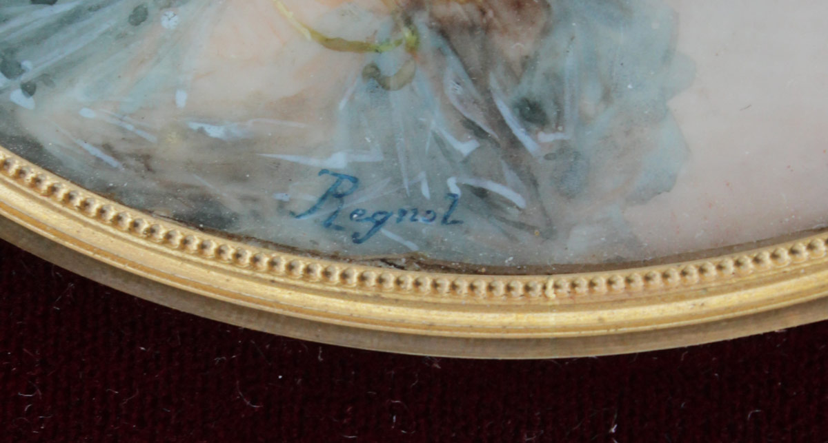 GOOD MINIATURE PORTRAIT PAINTING ON IVORY SIGNED REGNOL: Oval Sight size 3 1/2'' x 2 3/4'', gilded metal easel back frame 7 3/4'' x 5 1/2''.