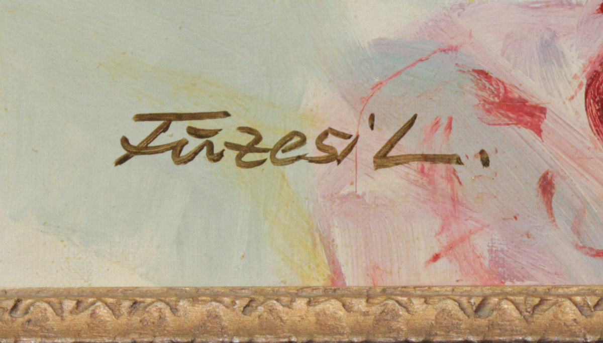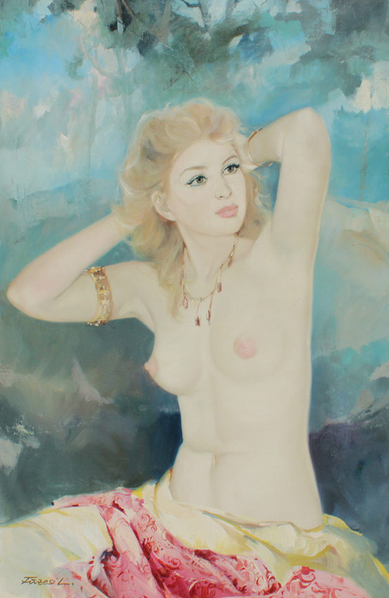FIRZESI, Lajos, (Hungarian, 20th C.): Female Nude, Oil/Canvas, 35 1/2''x 23 1/2'', signed lower left Firzesi?, carved and painted wood frame with wear, 41'' x 28 1/2''.