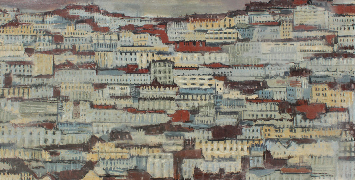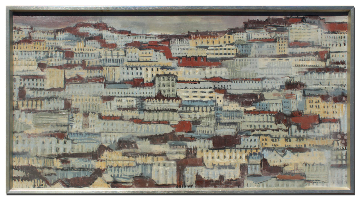 FRANZHEIM, Elizabeth, (American, 1923-1990): Modernist European City Scape, Oil/Canvas, 16'' x 30'', signed upper left, original frame 17 1/2'' x 31 1/2''.
