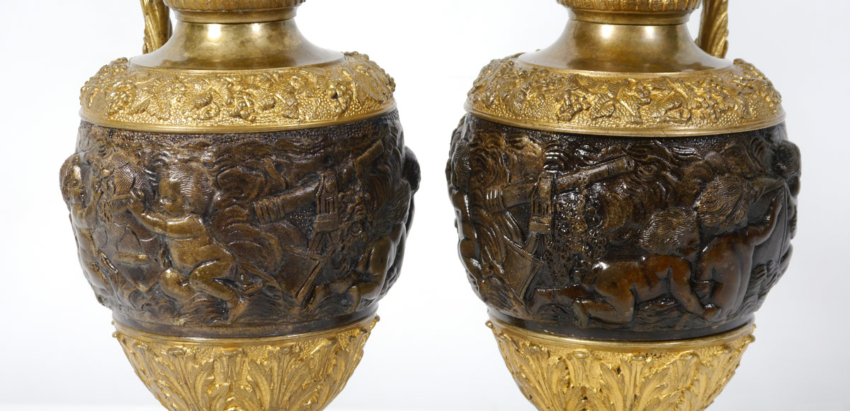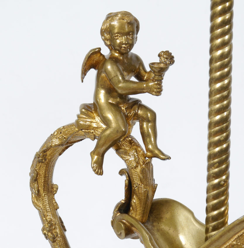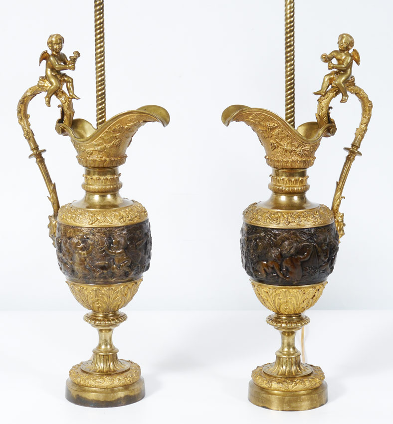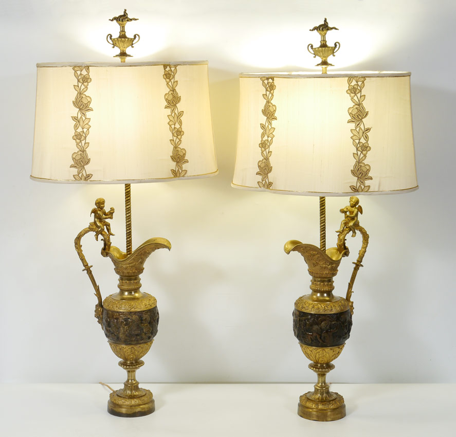 PR OF FIGURAL BRONZE EWER/ LAMPS: Parcel gilt bronze in high relief cupid and garland decoration. The central frieze depicts prancing putti. The handles are surmounted by figural cupids. The silk shades have applique panels. The finials are in the form of classical oil lamps. The lamp measures approx. 39'' tall overall, the shades 19'' dia.