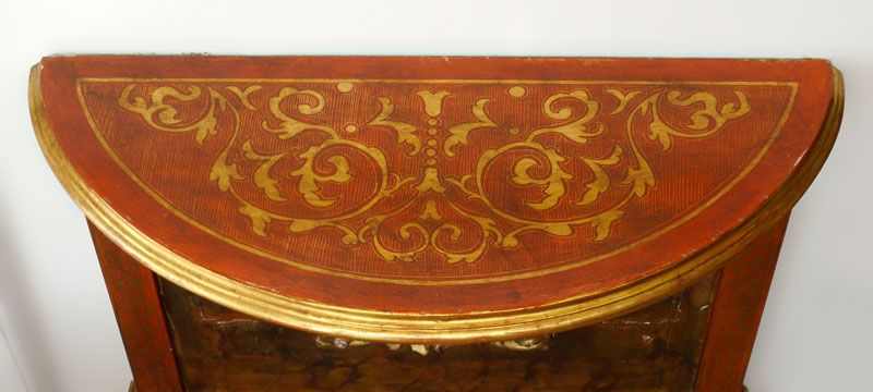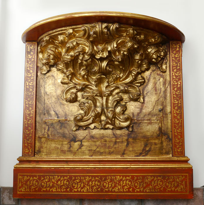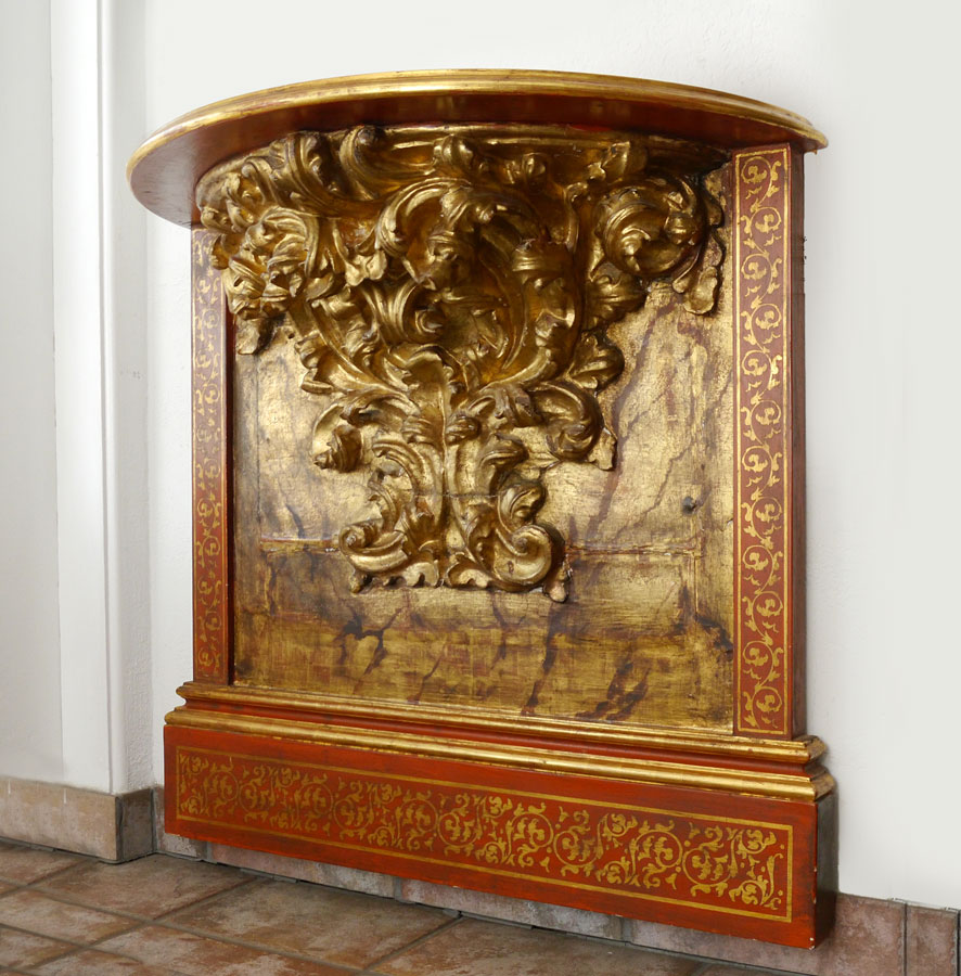 PAINTED AND GILT CARVED ARCHITECTURAL WALL SHELF: With foliate scroll gilt decorated designs on top, sides and base. Carved support for shelf. 31 1/2'' h. x 34'' l. x 13 3/4'' d.