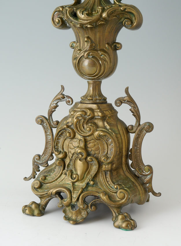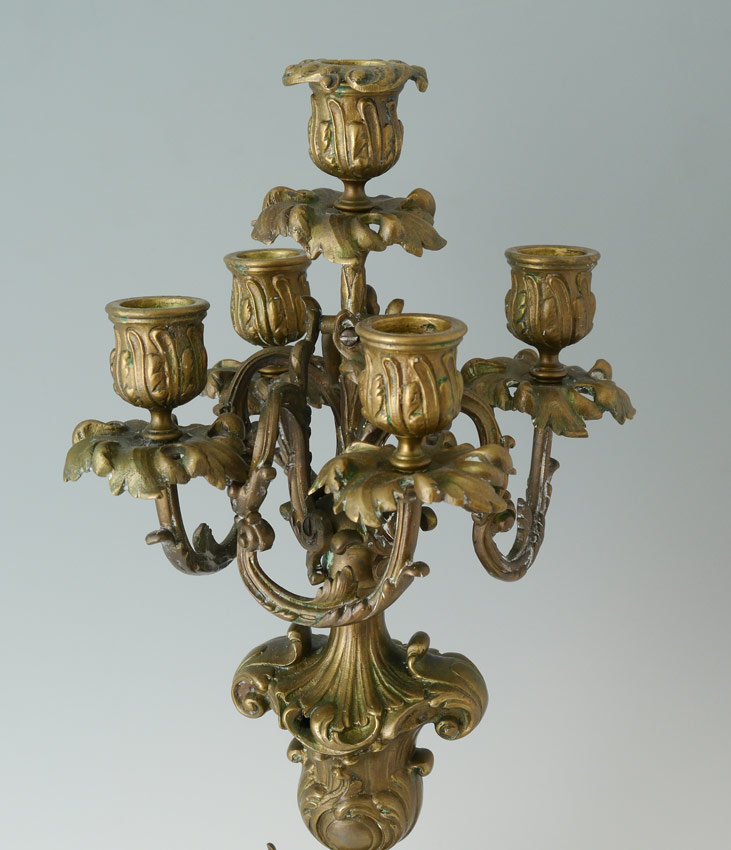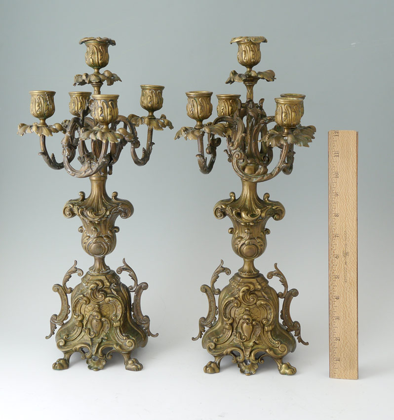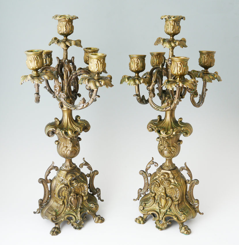 PR OF GILT BRONZE ROCOCO 5 LIGHT CANDELABRA: Unmarked as to maker, cast bronze, each with central bobeche and 4 arms. Foliate and shell decoration base, on 4 paw feet. Overall 16 3/4'' h x 7 1/4''. CONDITION: Looseness to several arms, uneven finish.