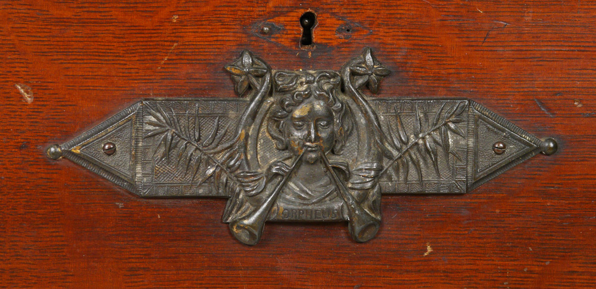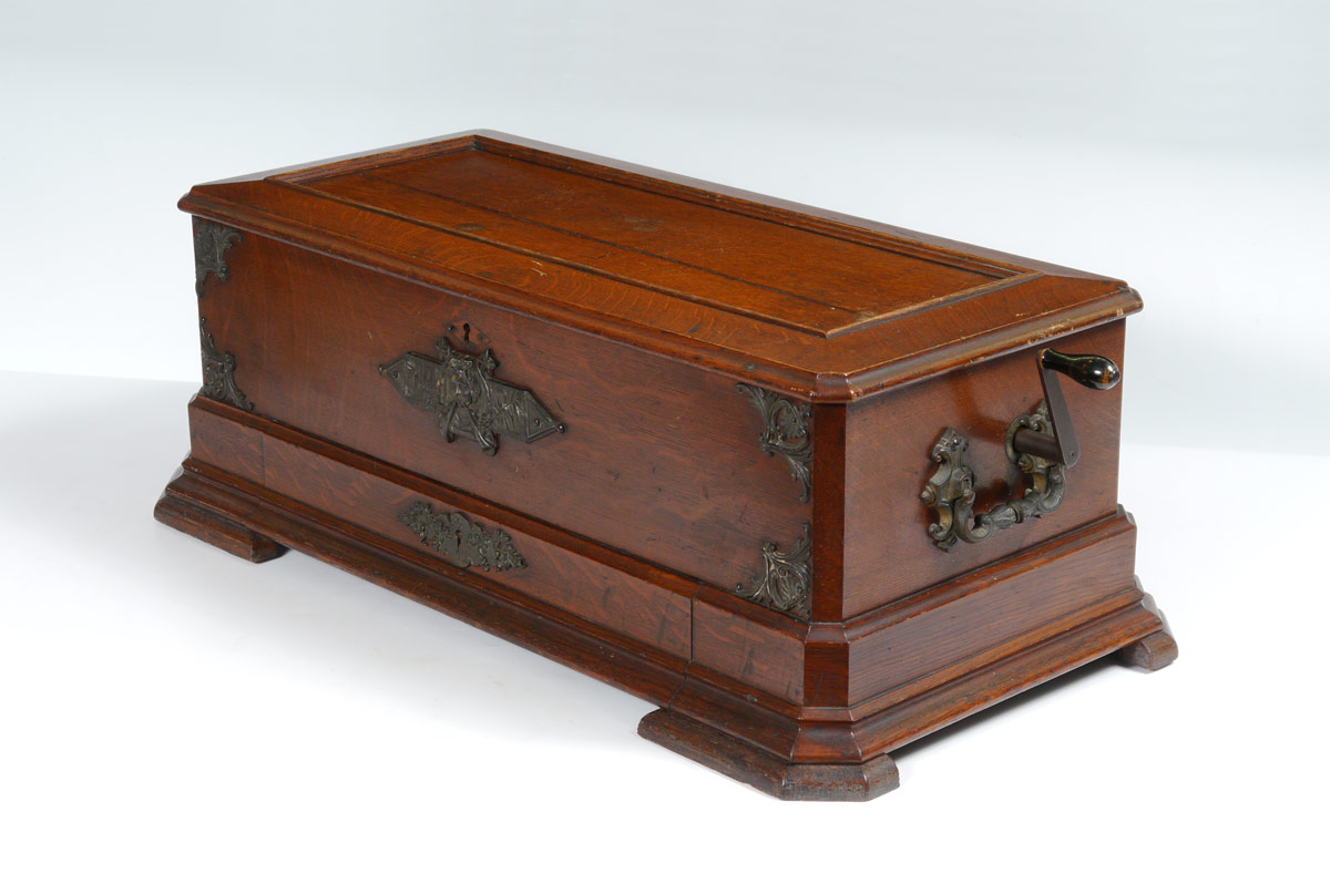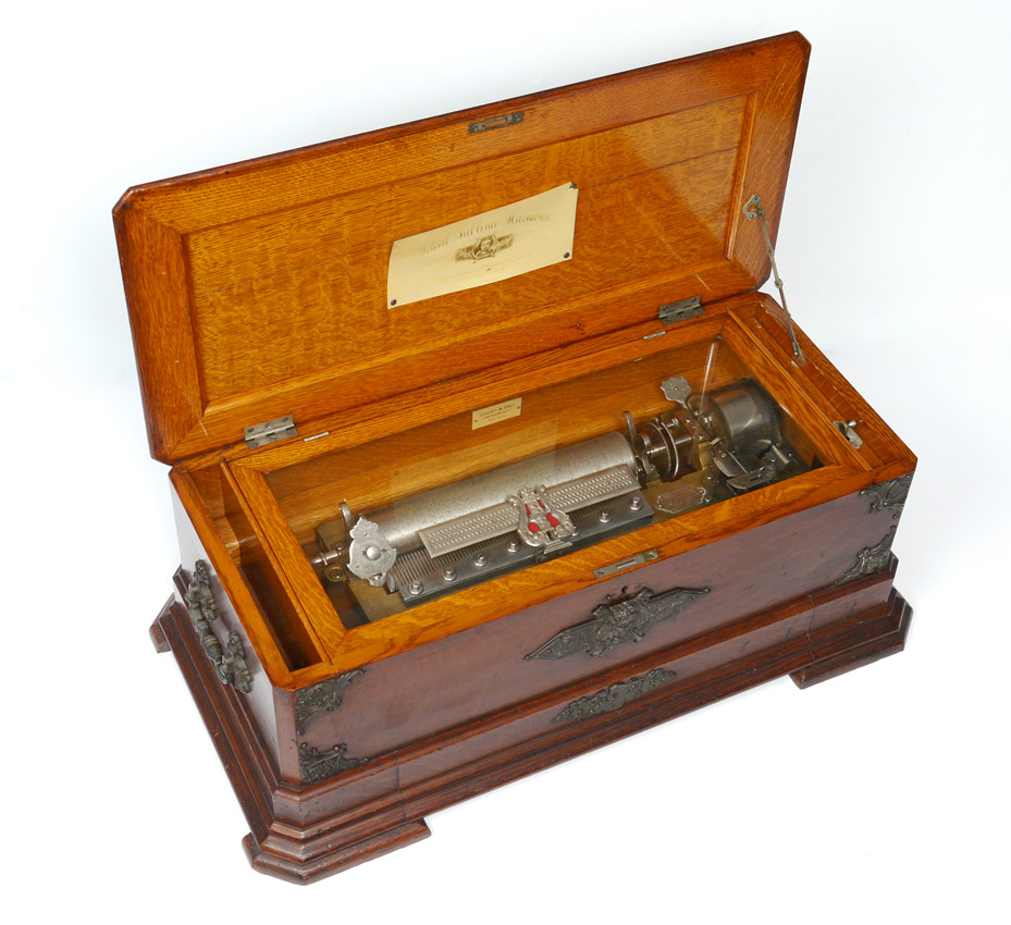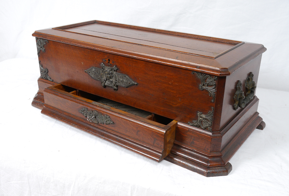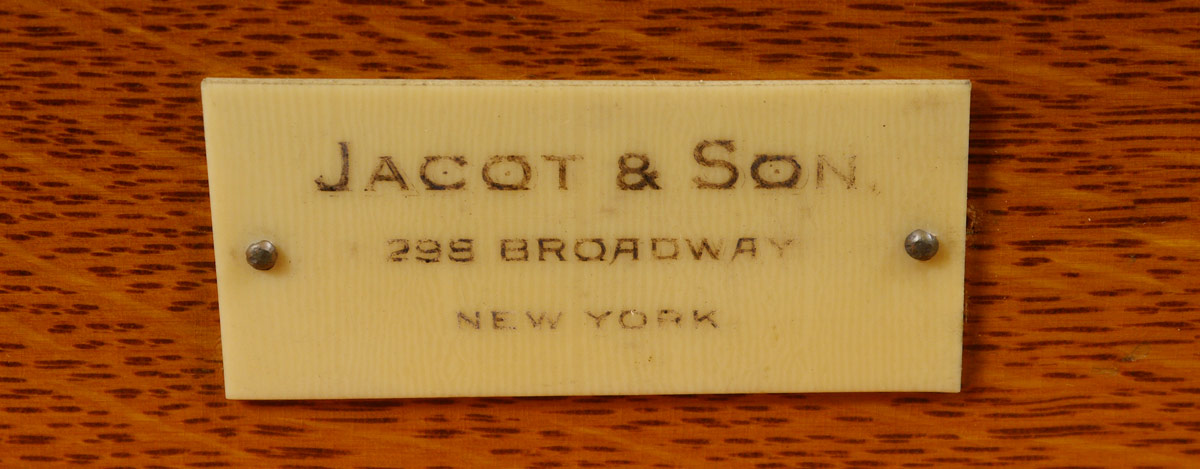 JACOT & SON SWISS CYLINDER MUSIC BOX: Tiger oak case with applied metal decoration including bust of Orpheus. Celluloid tag under lid reads Ideal Sublime Harmonie over Orpheus over illegible writing. Retailed by Jacot & Sons, 298 Broadway, New York. Clean movement, serial number 1458, with all teeth. Lower lockable shelf opens with original Jacot advertisement and empty Jacot bottle of music box oil. Key and crank in office. Measures 10 3/4'' h. x 30 1/4'' x 15 3/4''.